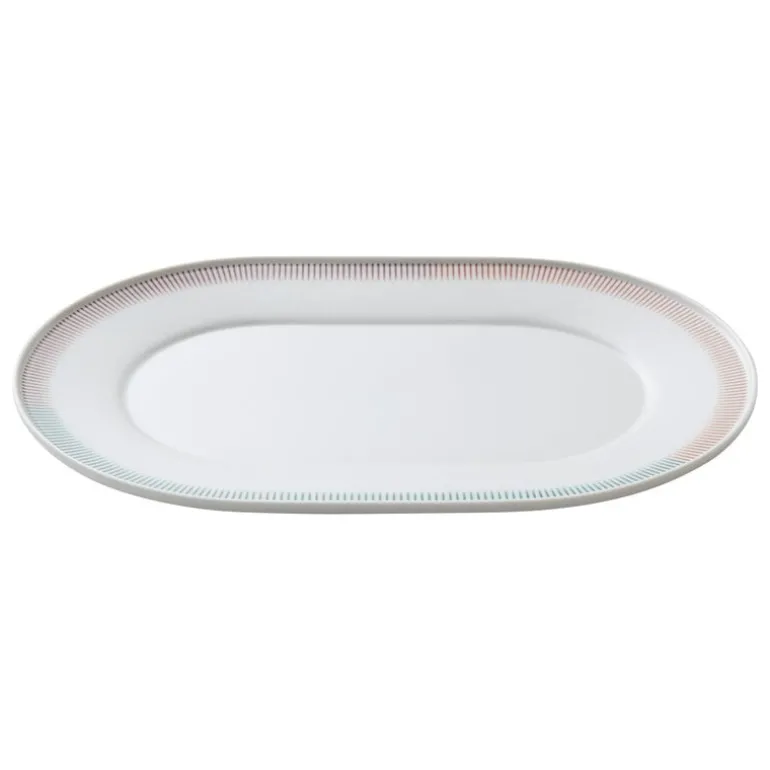 Uppläggningsfatet PC från 1616 / arita japan är smyckat med ett vackert randigt motiv i flera olika färger, som nästan ser ut som skuggningar i en färgteckning. Det ovala uppläggningsfatet kan med fördel användas till servering, antingen till festligt dukade bord vid särskilda tillfällen eller för att liva upp helt vanliga vardagsmåltider.