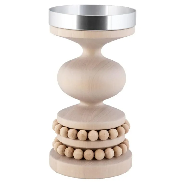 Ljusstaken Keisarinna, från Aarikka och med design av Kaija Aarikka från 1969, är en iögonfallande träljusstake med handvridna kurvor och två kransar gjorda av Aarikkas signaturpärlor i trä. Aluminiumtaket ger en stabil och säker bas för ett blockljus, vilket gör den perfekt för både speciella tillfällen och vardagsbruk. Ljusstaken, som fått sitt namn efter det finska ordet för kejsarinna, är handgjord i Finland.