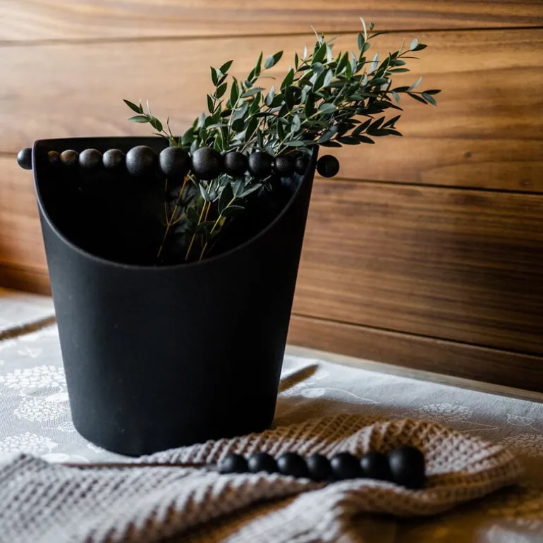 Aarikkas Nuppu-bastukopp blandar traditionellt finskt hantverk med en modern touch. Bastukoppen har ett handtag i metall som pryds av Aarikkas signatur, stora träpärlor, tillverkade av behandlad lönn. Nuppu-bastukoppen passar perfekt ihop med bastuhinken från samma kollektion.