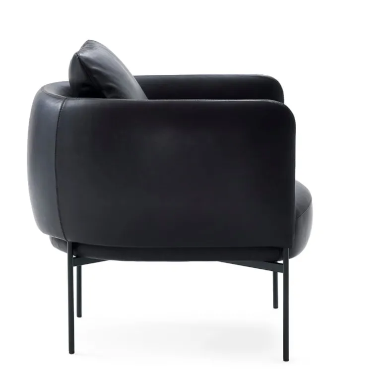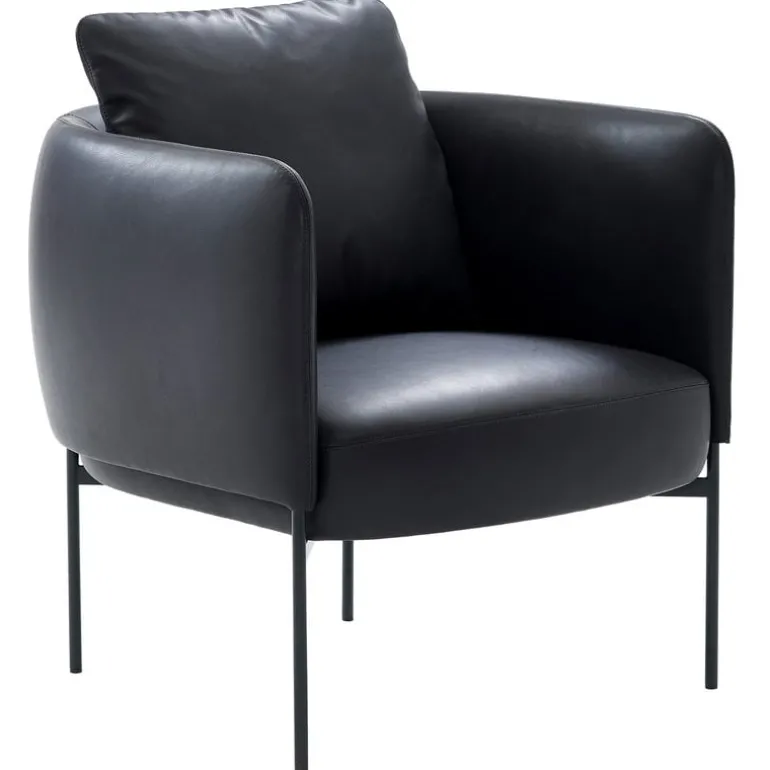 Clubfåtöljen Bonnet från Adea har ett grafiskt utseende som är ett resultat av kombinationen av eleganta, svarta metallben och ett kurvigt skal som klätts i anilinläder. Den fluffiga ryggkudden ger fåtöljen en ledig touch.