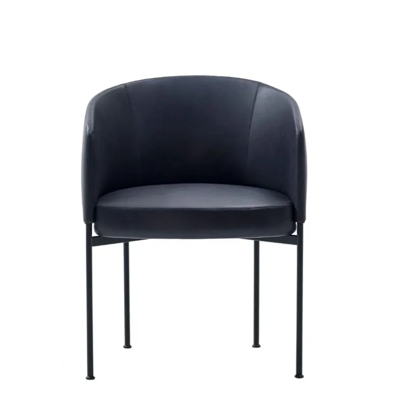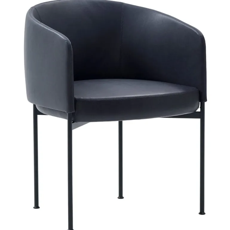 Matstolen Bonnet från Adea har ett grafiskt utseende som är ett resultat av kombinationen av eleganta, svarta metallben och ett kurvigt skal som klätts i anilinläder. Stolen är perfekt till matbordet eller som sidostol i ett annat rum.