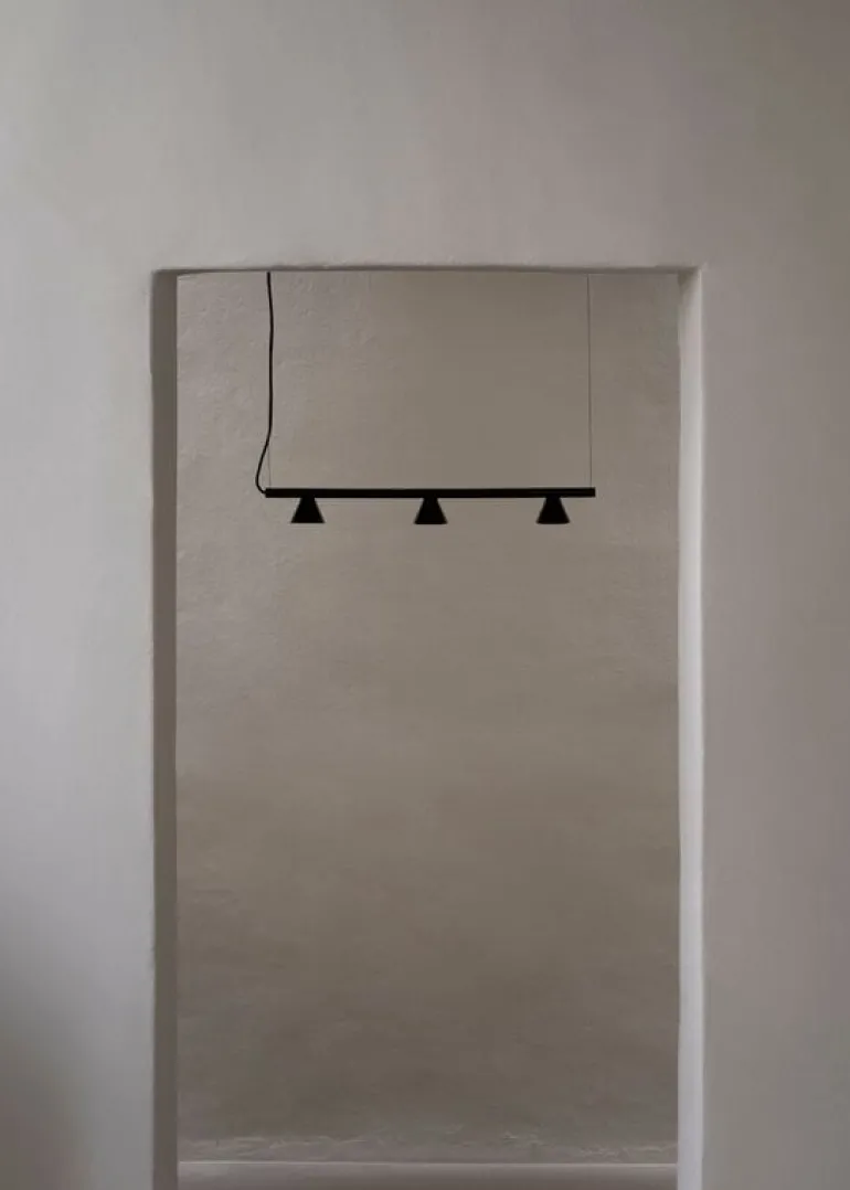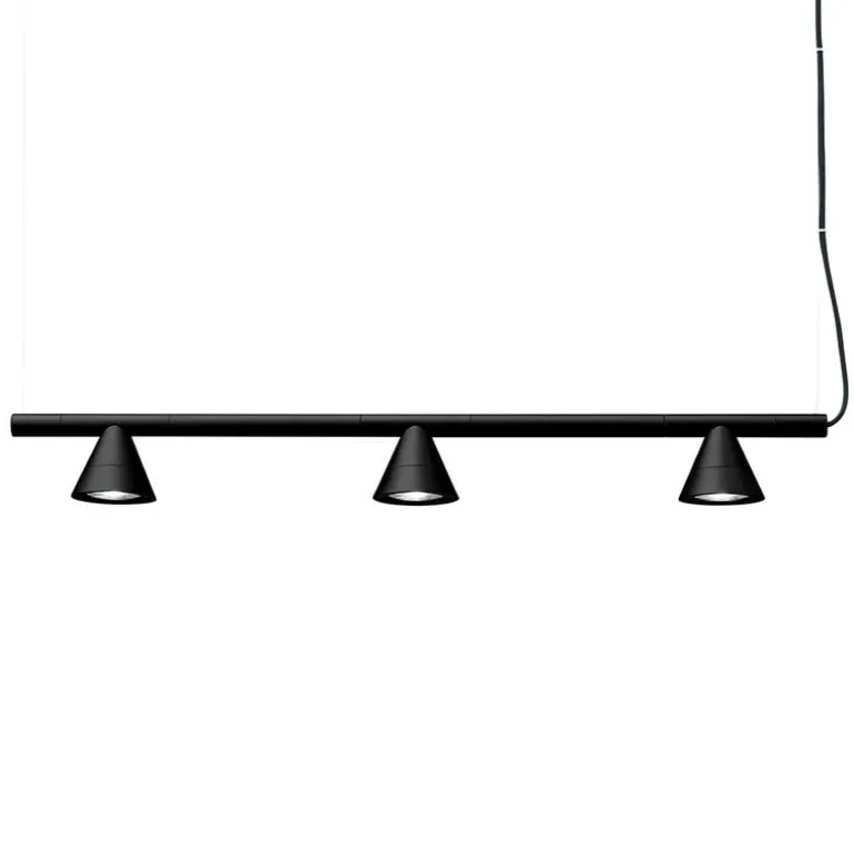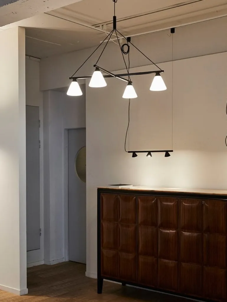 AGOs pendellampa Probe är en komposition av en svart, geometrisk metallbas och konformade skärmar med spotlights. Den ger ett mjukt, diffust sken som passar bra i matrummet eller på kontoret.