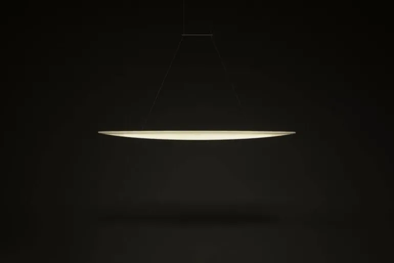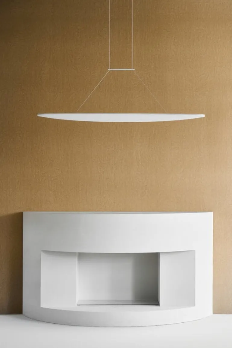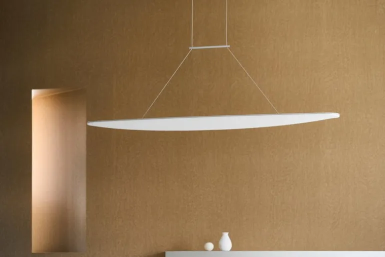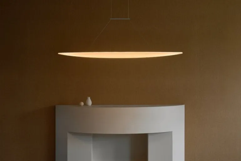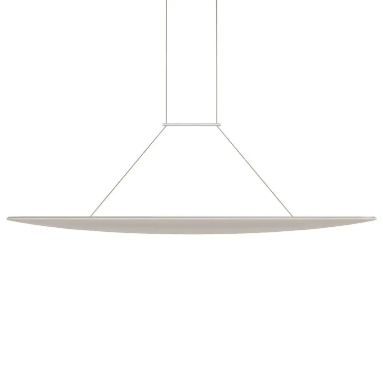 AGOn Voyages pendellampa sprider ett varmt och mjukt sken som lyser genom den naturligt vita tygskärmen. Vecken som löper över skärmens yta ger designen en subtil känsla av textur och livfullhet. Med en imponerande diameter på 130 cm är den stora Voyage Linear pendellampan perfekt för att ge ett bländfritt och dimbart ljus över ett stort matbord eller i ett vardagsrum eller lounge.