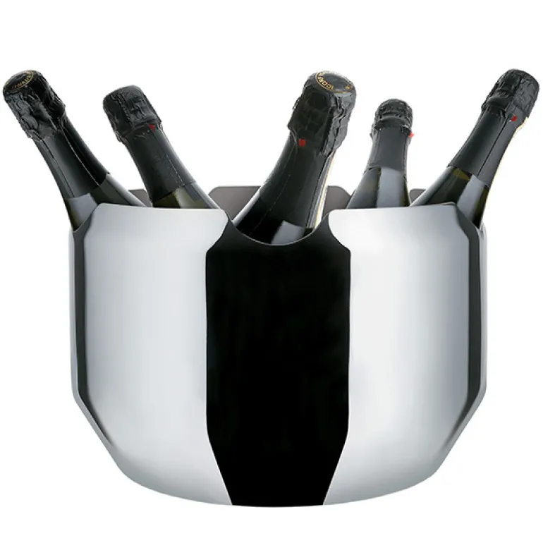 Noe vinkylare, designad av Giulio Iacchetti för Alessi, rymmer upp till fem flaskor vin eller champagne. Den eleganta kylaren är tillverkad av rostfritt stål.