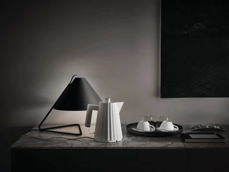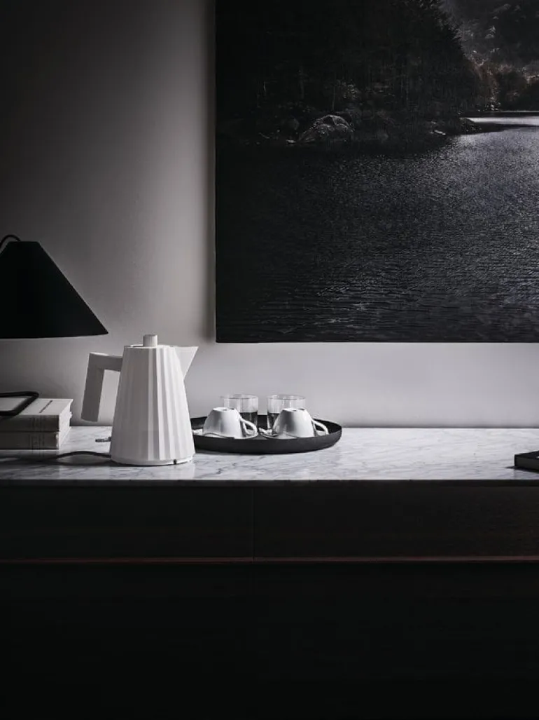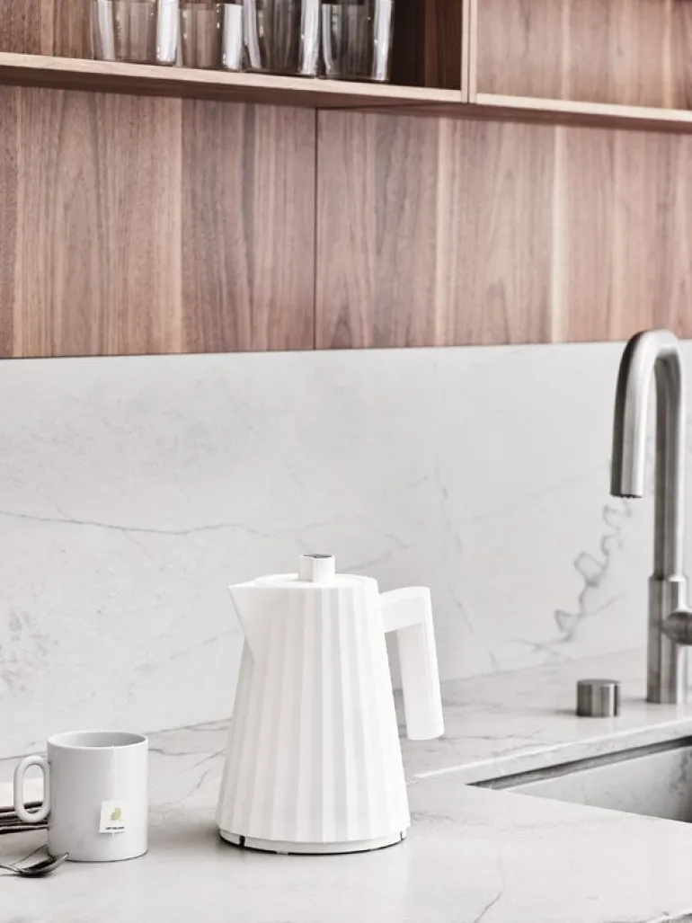 Plissé vattenkokaren från Alessi hämtar inspiration från mode- och arkitekturvärlden. Dess tredimensionella yta påminner om plisserat tyg och har en dynamisk, skulptural silhuett. Plissé, som designades av Michele De Lucchi år 2018, är perfekt för att koka och servera hett vatten, tack vare dess värmeisolerade bas som gör att man enkelt kan placera vattenkokaren på en bordsskiva. Vattenkokaren har ett kalkfilter och en säkerhetsfunktion som automatiskt stänger av strömtillförseln om det inte finns tillräckligt med vatten inuti. Värmeelementet är dolt i basen för att förenkla rengöring.