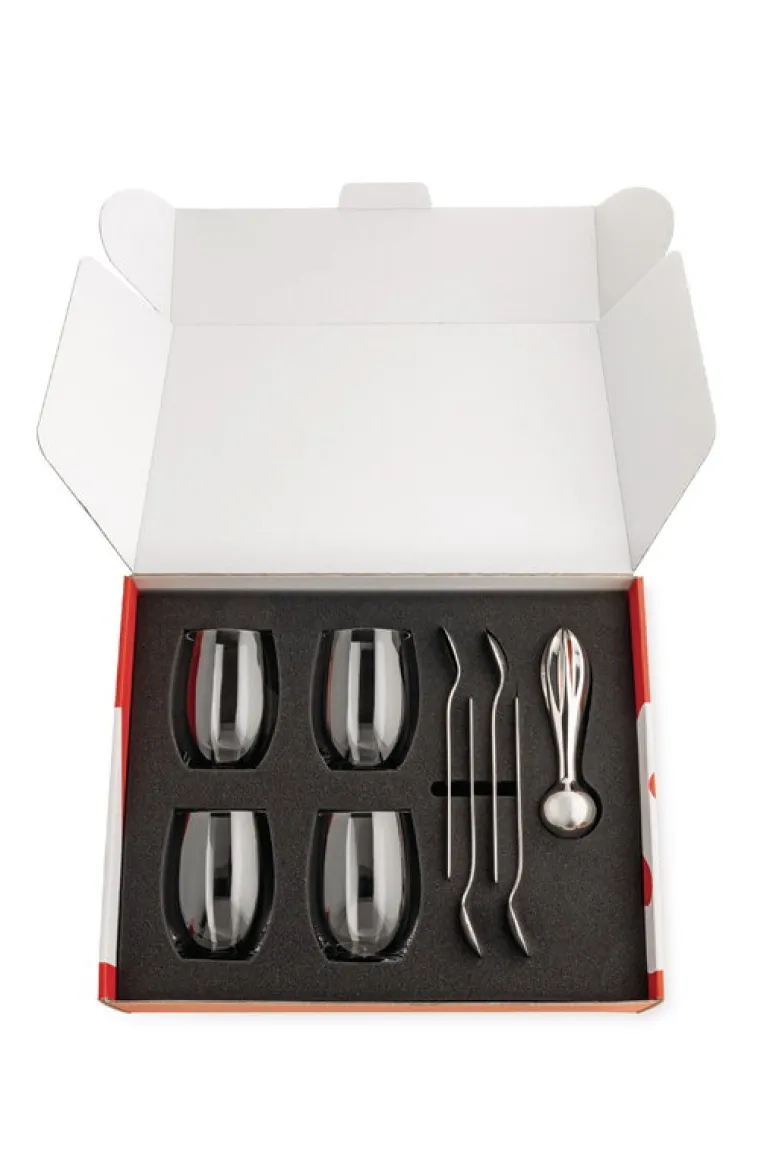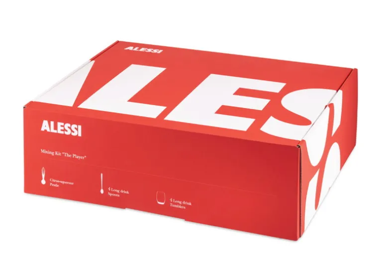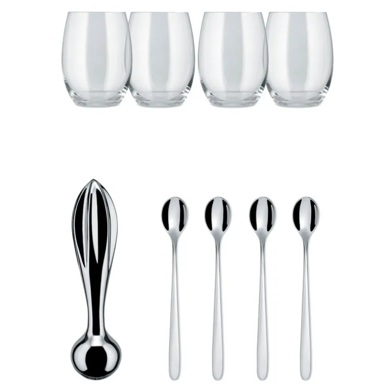 The Player cocktailset från Alessi kommer att ge cocktailentusiasten ett brett leende på läpparna. Stilen och kvaliteten passar alla smaker. Cocktailsetet, som är designat av Stefano Giovannoni, Guido Venturini och Achille Castiglioni, innehåller fyra långa drinkskedar, fyra höga drinkglas och en citruspress som även kan användas som mortelstöt. The Player ett elegant val för varje mixolog och passar lika väl till en mysig hemmadejt som för större sammankomster. The Player är den perfekta presenten till en mixologientusiast, som även ger en touch av elegans till både vardagliga och högtidliga stunder.