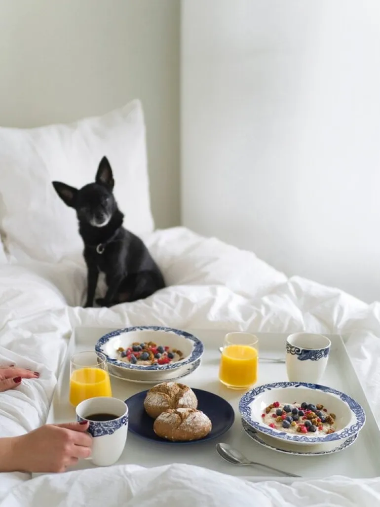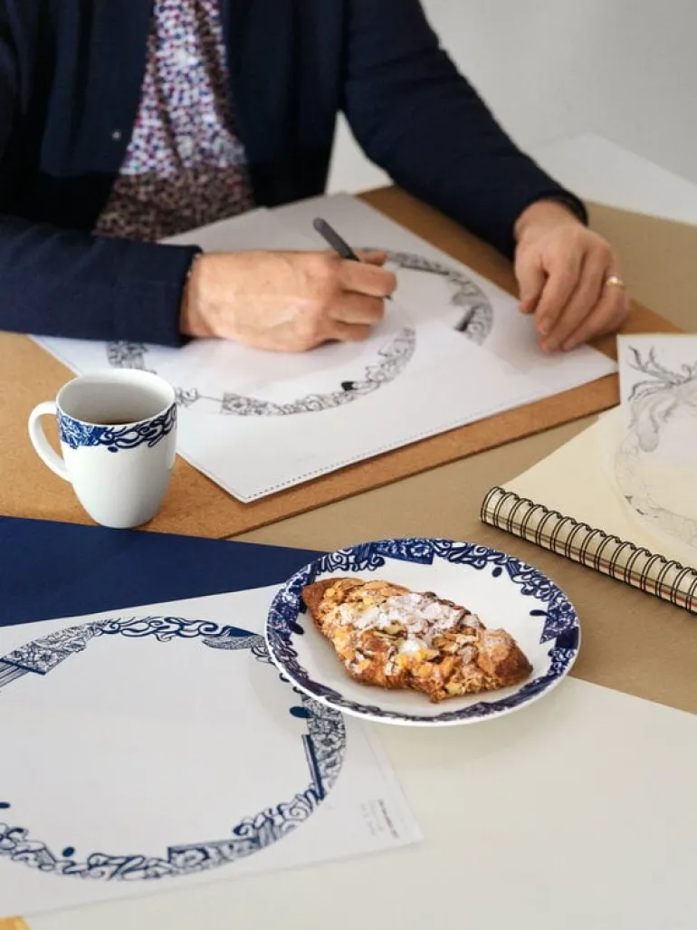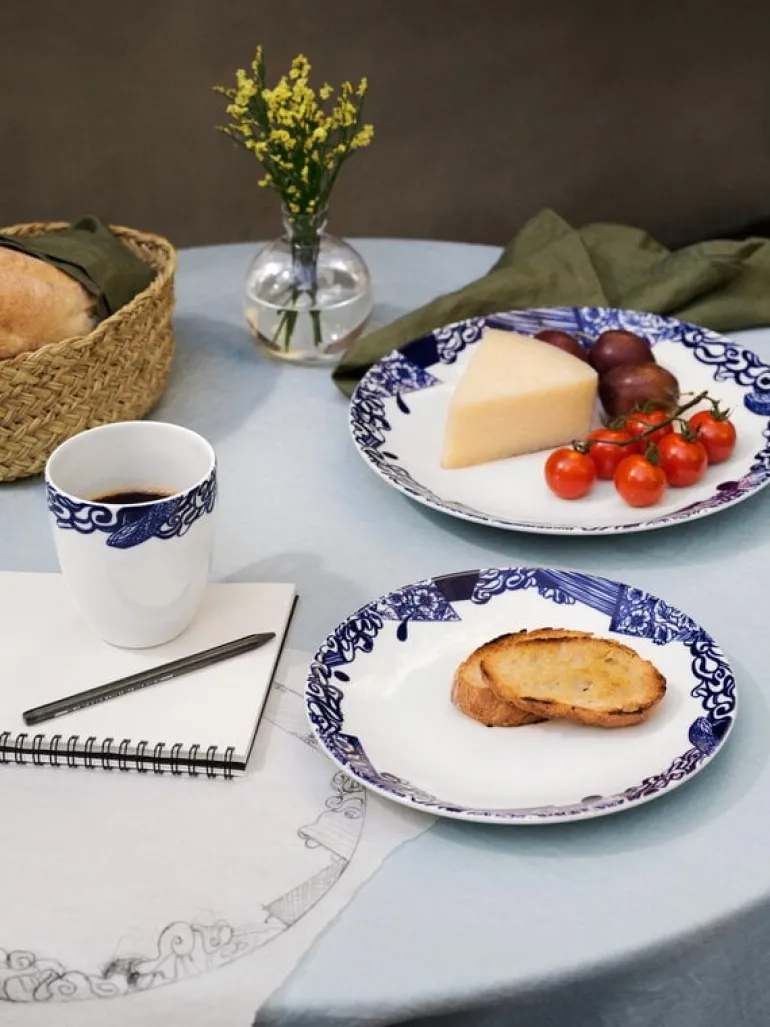 Muggen 24h Piennar, från Arabia, är prydd med ett blått mönster som skapats av Heikki Orvola för att fira 25-årsjubileet av serviskollektionen 24h. Mönstret skapas med en collageteknik och är en mix av moderna och traditionella stilar: utöver fina blommor har det även olika abstrakta inslag.