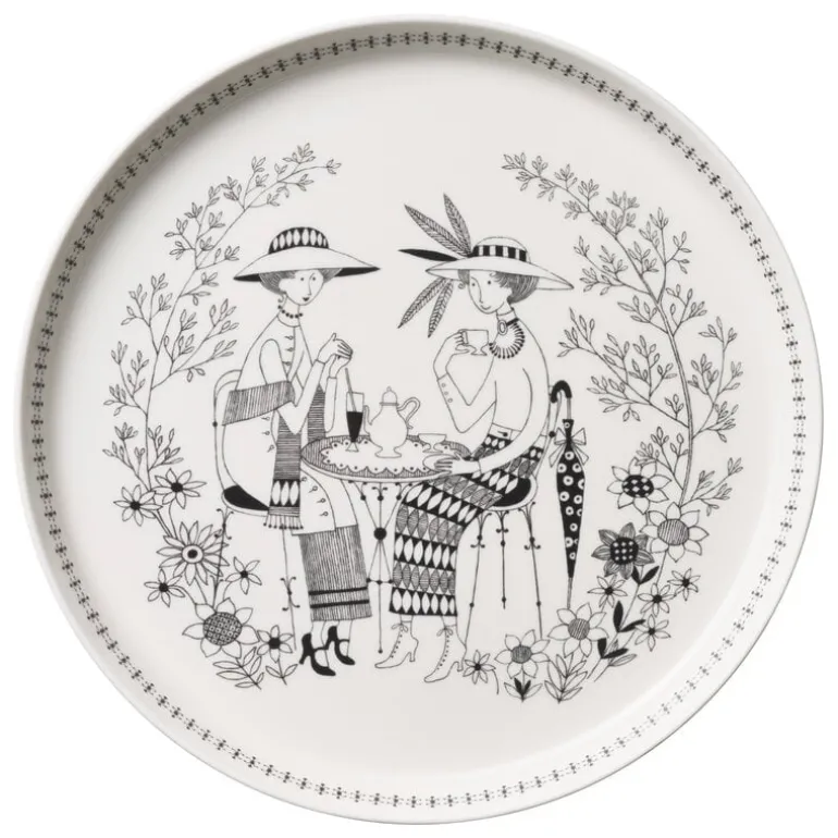 Arabias tallrik Emilia har dekorerats med en ljuvlig dekoration av Raija Uosikkinen. Hon designade ursprungligen den vackra Emilia-dekorationen 1957 och serien producerades sedan av Arabia fram till 1966. Emilia medförde en fascinerande kontrast till de annars simpla och eleganta designerna under 50-talet. Den var dekorerad med vinstockar och vackra detaljer samtidigt som den begränsades med sin svartvita färg. Arabia återlanserade produkten under 2023.