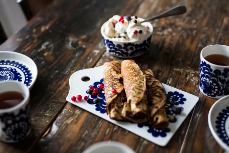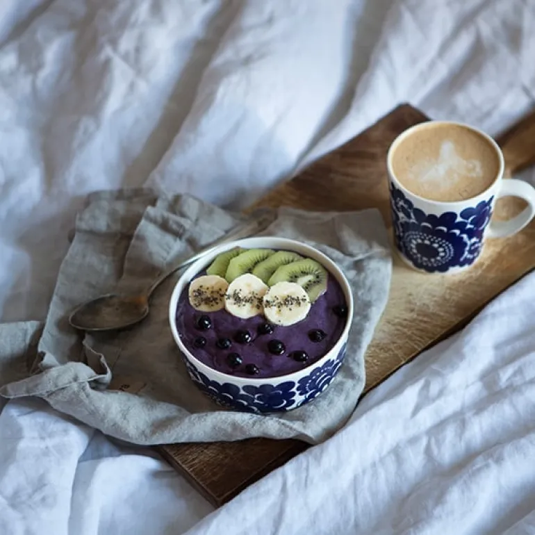Muggen Esteri från Arabia är dekorerad med ett vackert blomstermotiv, designat av Esteri Tomula år 1973 som en hyllning till fabrikens hundraårsdag. Mönstret Esteri har fått sitt namn efter sin skapare, och porslinet var ursprungligen prytt i både blått och brunt. Det fräscha, blå-vita mönstret representerar och tillför ett förtjusande drag av finsk 70-talsdesign, som passar till middagar i all enkelhet såväl som till högtidliga tillfällen.