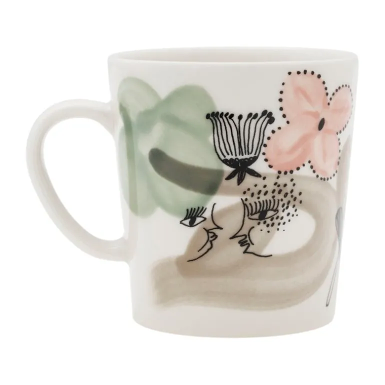 Muggen Kukkamaa från Arabia är dekorerad med ett glatt mönster av konstnären Armi Teva. På muggen syns fantasifulla figurer som tittar fram mellan blommande växter för att hälsa morgonkaffedrickaren välkommen. De handritade linjerna och de dynamiska penseldragen fångar upp den fräscha och hoppfulla energin från våren i full blom.