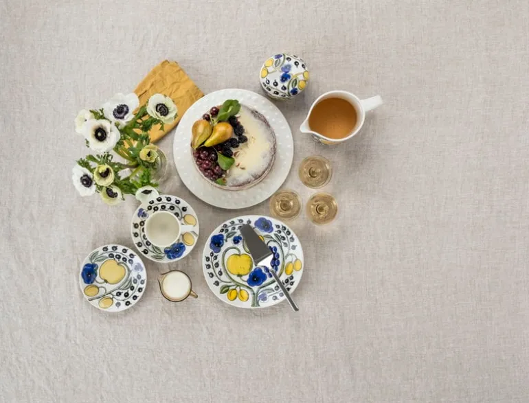 Paratiisi-fatet från Arabia är dekorerat med Birger Kaipiainens gulblå tema som ger en tidlös och somrig känsla till det frodiga blommönstret.
