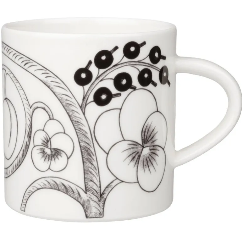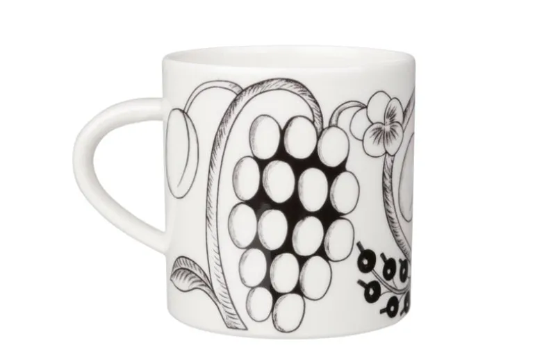Paratiisi-muggen från Arabia är smyckad med svart och vitt som ger en grafisk touch till blommönstret.