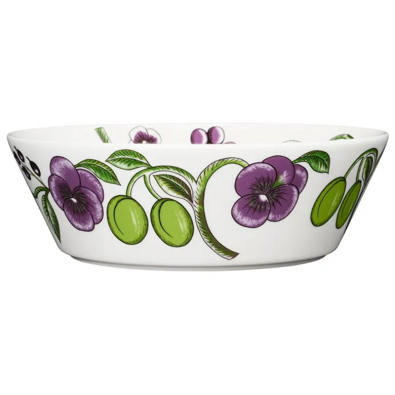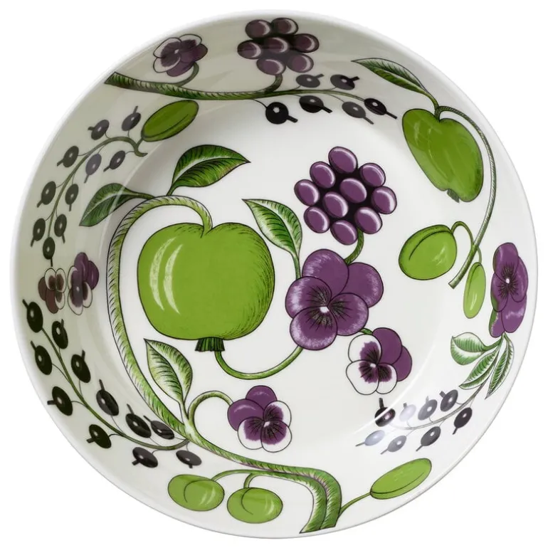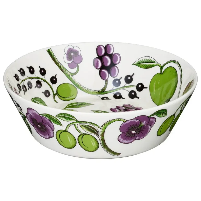 Serveringsskålen Paratiisi från Arabia är dekorerad med Birger Kaipiainens frodiga blommönster, som ger bordsporslinet en tidlös, somrig känsla. Paratiisis mest kända färgkombination är gult och blått, men den ovanligare konstellationen med lila och grönt ger den klassiska designen djup och dramatik.