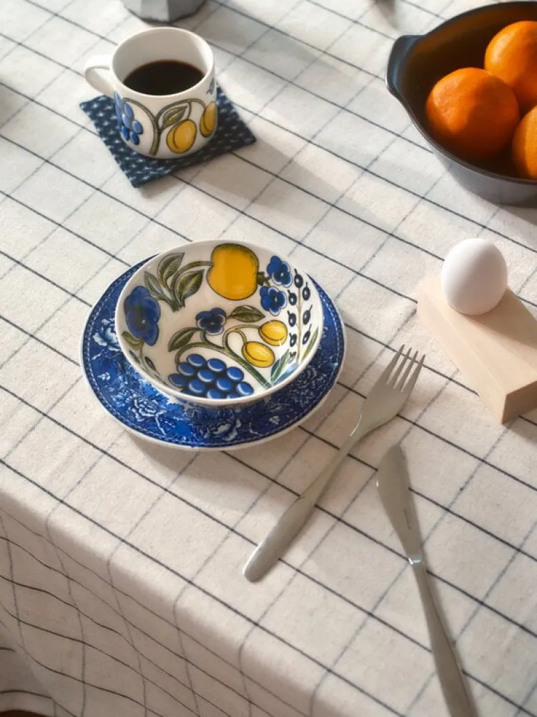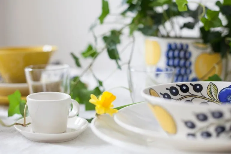 Paratiisi-skålen från Arabia är smyckad med Birger Kaipiainens gulblåa tema som ger en tidlös, somrig känsla till det frodiga blommönstret.