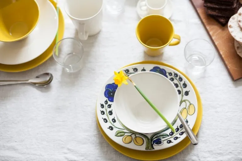 Paratiisi-tallriken från Arabia är prydd med Birger Kaipiainens gulblå tema som ger det frodiga blommönstret en tidlös, somrig känsla.