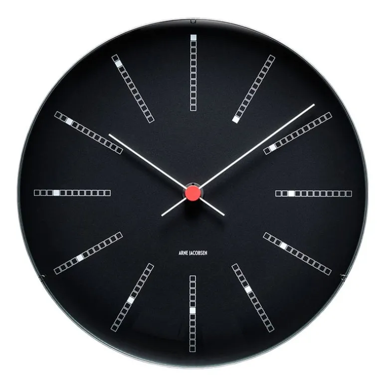 Den minimalistiska AJ Bankers-väggklockan kännetecknas av en monokrom urtavla med vita visare och en röd detalj i mitten. Det specialdesignade höljet i aluminium ger klockan ett flytande utseende när den är monterad på väggen.