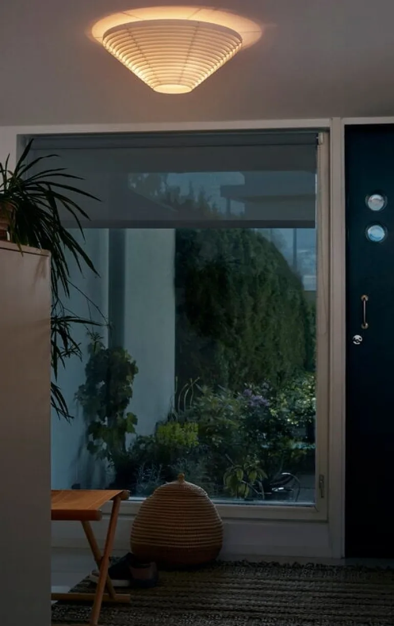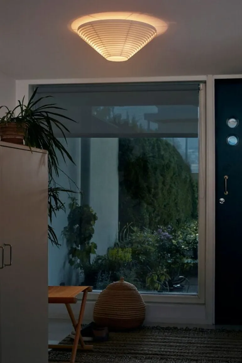 Arteks taklampa A622B ger ett mjukt ljus som filtreras genom tunna lager av vitlackerade stålremsor. Den enkla, konformade lampan ser vacker ut ensam eller i par, och i större utrymmen kan de monteras i grupp. Alvar Aalto designade A622B-lampan 1953 för Pensionsmyndigheten i Helsingfors, och dess tidlösa elegans kan enkelt komplettera moderna hem och offentliga utrymmen.