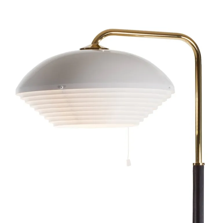 Arteks golvlampa A811 består av en välbalanserad kombination av olika färger och material: stativet är gjort av polerad mässing och svart läder, medan skärmen har tunna metallremsor varvade i lager som får lampan att avge ett varmt, dämpat sken. A811 lanserades år 1965 och har designats av Alvar Aalto. Dess utseende har likheter med lampkollektionen som Aalto designade på 1950-talet för Folkpensionsanstalten i Helsingfors, och med sin tidlösa elegans kan den enkelt komplettera inredningen i moderna hem såväl som offentliga miljöer.