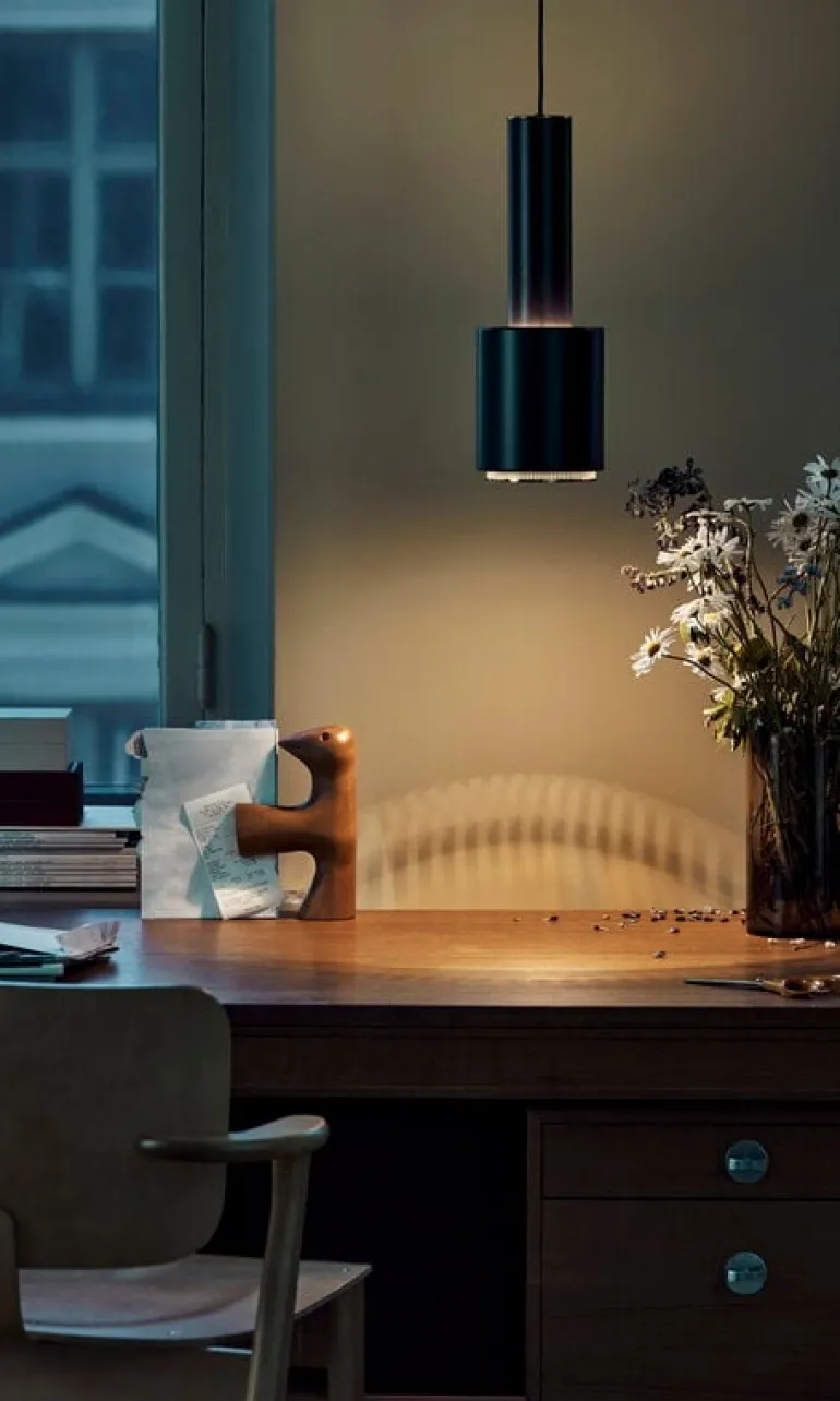 Alvar Aalto designade Arteks taklampa A110, skämtsamt kallad Hand Grenade (Handgranaten), 1952. Lampans skönhet utgår från dess form, som är enkel och tidlös. Pendellampan A110 består av två cylindrar, den ena inuti den andra, och ljuset reflekteras uppåt vid den punkt där cylindrarna möts. En elegant detalj på A110 är den perforerade mässingspläterade stålringen som sprider det nedåtriktade ljuset på ett vackert sätt. I likhet med många andra lampor som skapats av Aalto kan även Hand Grenade hängas upp i grupp.