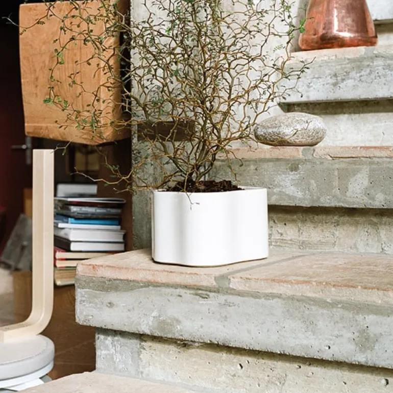 | Riihitie-krukorna, som Aino Aalto designade till familjens hem i Helsingfors, ingick i den samling som Aalto presenterade på världsutställningen i Paris 1937. 80 år senare lanserade Artek keramikkrukorna, som är uppkallade efter gatuadressen där de först skapades och användes, för att fira hundraårsjubileet av Finlands självständighet. Riihitie-krukorna är handgjorda, och inspirationen till den blå och vita färgen är hämtad från keramikplattorna i Muuratsalo Experimenthus, som också är känt som familjens sommarställe. Krukornas organiska och böljande design speglar Aaltos nära kontakt med naturen. |