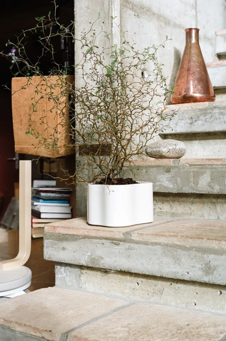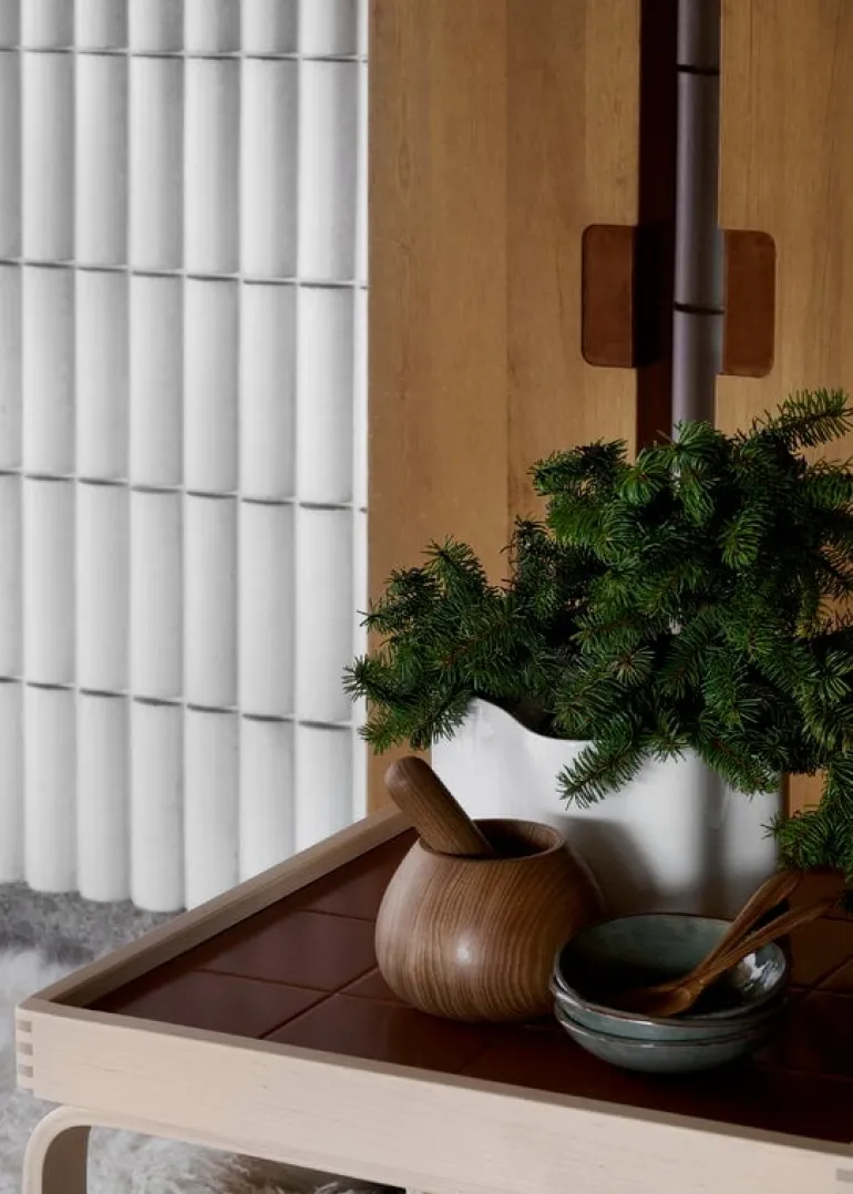 | Riihitie-krukorna, som Aino Aalto designade till familjens hem i Helsingfors, ingick i den samling som Aalto presenterade på världsutställningen i Paris 1937. 80 år senare lanserade Artek keramikkrukorna, som är uppkallade efter gatuadressen där de först skapades och användes, för att fira hundraårsjubileet av Finlands självständighet. Riihitie-krukorna är handgjorda, och inspirationen till den blå och vita färgen är hämtad från keramikplattorna i Muuratsalo Experimenthus, som också är känt som familjens sommarställe. Krukornas organiska och böljande design speglar Aaltos nära kontakt med naturen. |