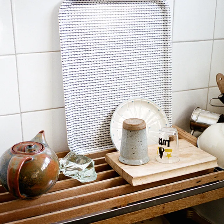 Rivi bricka, designad av Ronan och Erwan Bouroullec för Artek, kännetecknas av sitt unika textilmönster, som består av rader med långa, parallella linjer och fina detaljer. Den rektangulära brickan är tillverkad av laminerad plywood och papper.