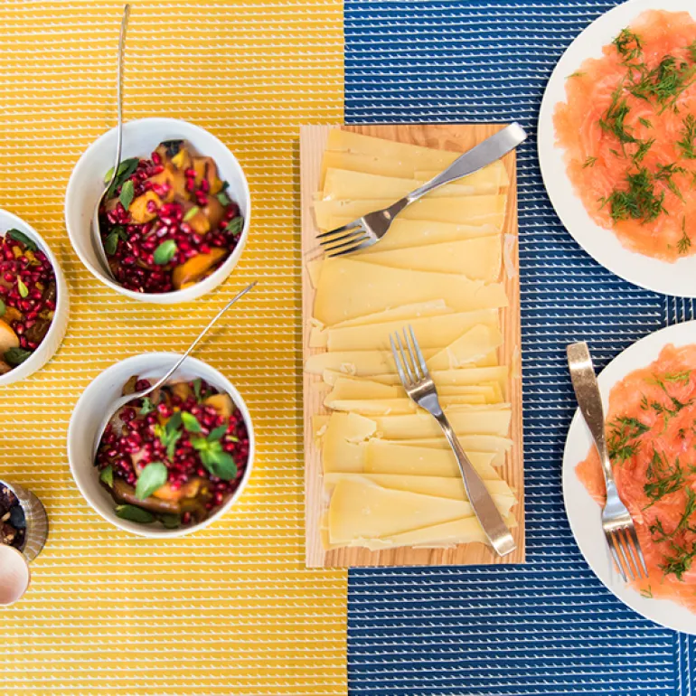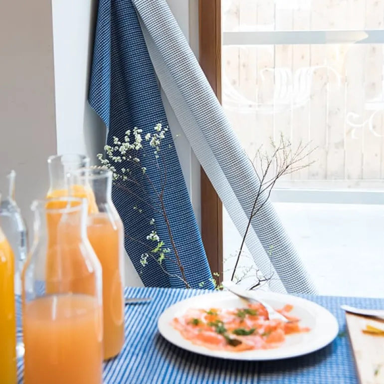 Attraktionskraften hos Rivi, som betyder “linje” på finska, ligger i de handmålade linjerna. Artek, med lång tradition av att skapa möbler i trä, ser de naturliga oregelbundenheterna som värdefulla i sig snarare än en brist. I Rivis hemkollektion ingår tyger, kuddfodral, brickor, necessärer och väskor i ett spektrum av nordiska färger.