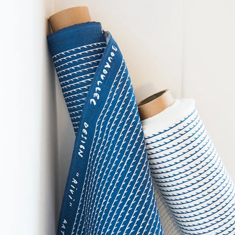 Rivi-tyget, designat av Ronan och Erwan Bouroullec för Artek, kännetecknas av sitt unika textilmönster, som består av rader med långa, parallella linjer och fina detaljer. Tyget är färdigskuret och tillverkat av stark bomullskanvas.