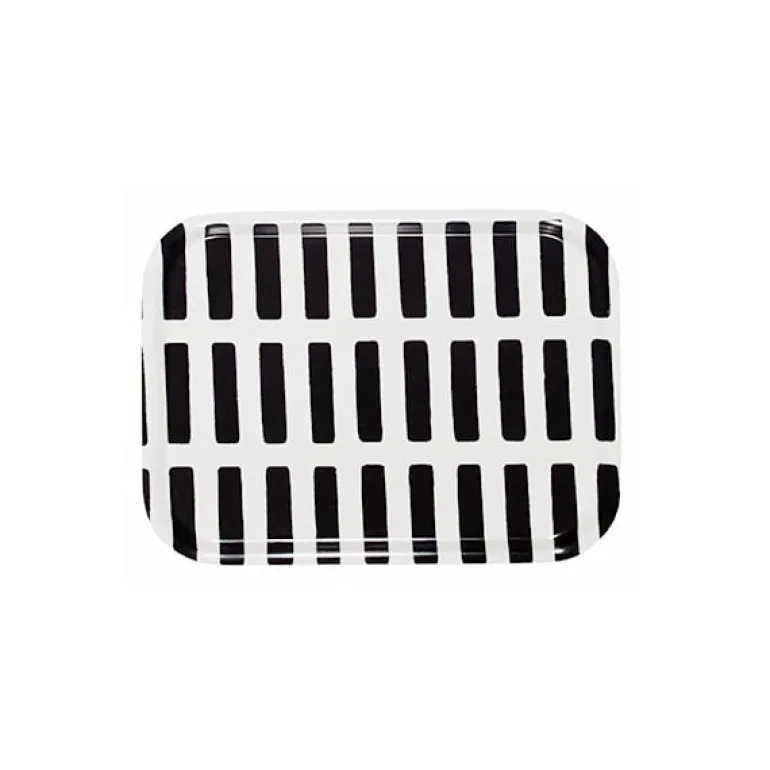 Arteks bricka Siena har ett vackert, grafiskt mönster och designades av Alvar Aalto 1954. Den rektangulära brickan är tillverkad av laminerad plywood och papper.