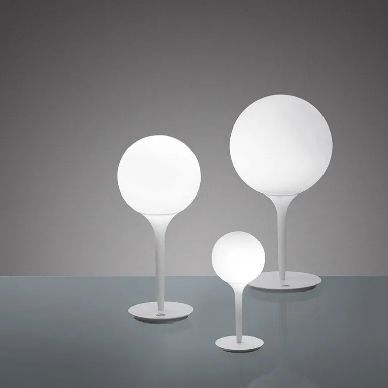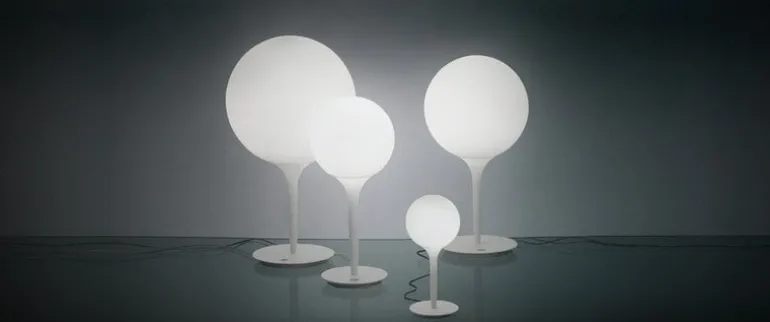 Bordslampan Castore 35 från Artemide består av en rund, lysande glob och en avsmalnande fot, vilket ger ett intryck av gradvist dimmande ljus. Skärmen är tillverkad av blåst glas, foten utgörs av lätt genomskinlig plast och basen är av metall.