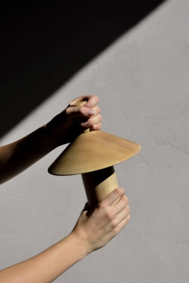 Pepa är tillverkad av naturligt askträ och har en taktil yta som inbjuder dig att röra vid och känna dess unika ådringsmönster. Den bärbara lampan ger en varm elegans till hemmet eller sommarstugan, medan den sladdlösa designen gör den lätt att flytta runt. Pepa-lampan drivs av uppladdningsbara batterier och laddas med en USB-C-kabel.