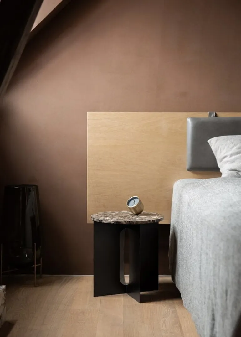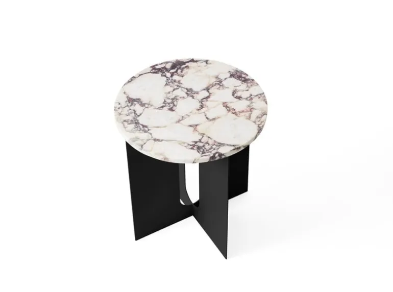 Den bruna marmorskivan Calacatta Viola ger en sofistikerad finish åt sidobordet Androgyne från Audo Copenhagen. Djärv, livfull marmor skapar en spännande kontrast till den eleganta ramen och Androgynes moderna stil. Audo Copenhagens Androgyne-kollektion designades av Danielle Siggerud.