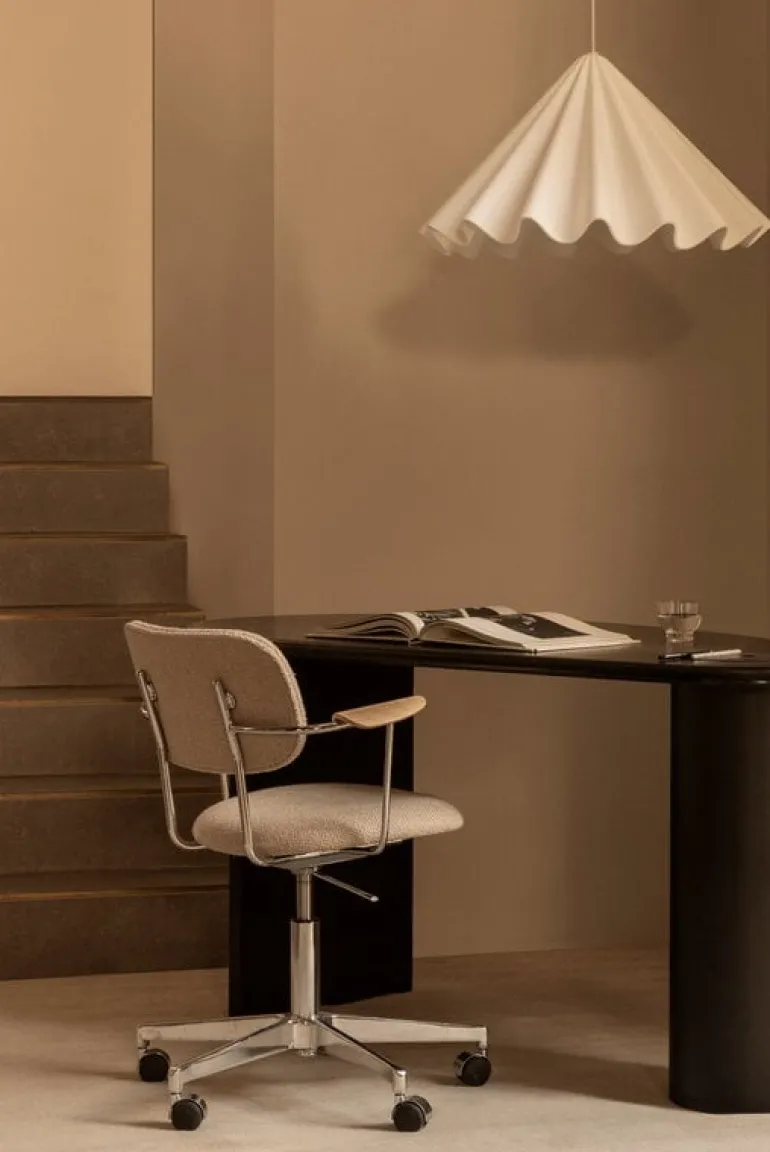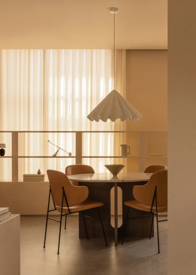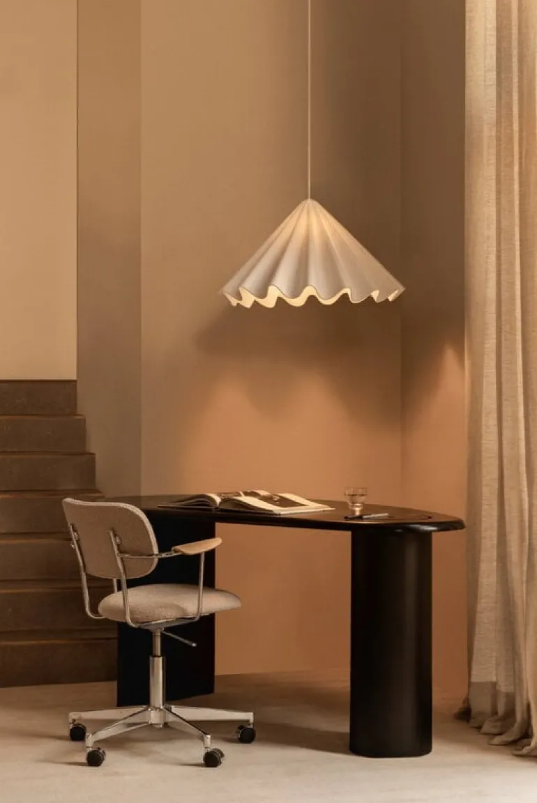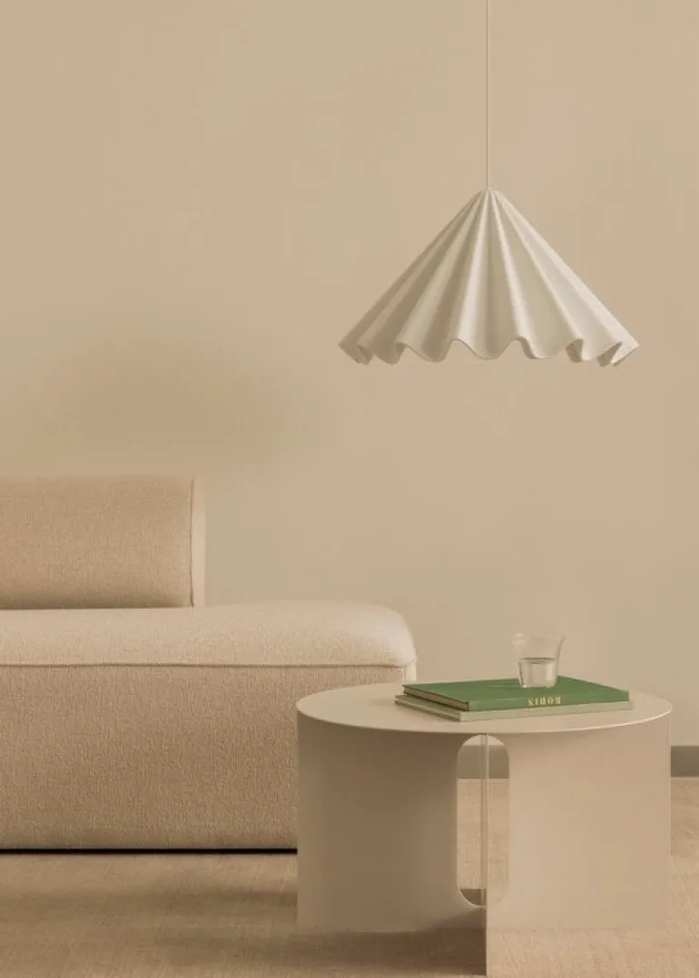 Audo Copenhagens pendellampa Dancing är en vacker ljuskälla som efterliknar den graciösa rörelsen hos en dansande kjol. Pendellampan, som designats av Iskos-Berlin, är tillverkad av pressat filt, ett återvunnet material som tillverkas huvudsakligen av använda vattenflaskor. Därför reflekterar skärmen inte bara ljus utan absorberar även ljud. Med sin djärva design och imponerande storlek är Dancing-pendellampan en riktig statement-piece som omedelbart blir iögonfallande i alla rum. Oavsett om det är i matrummet, vardagsrummet eller på kontoret, så kommer Dancing Pendant Light att fängsla och inspirera.