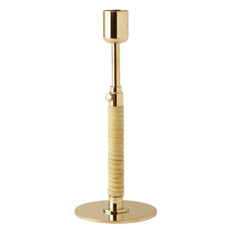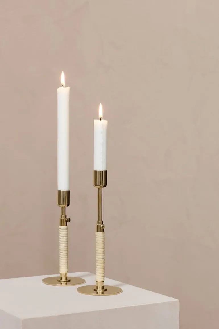Audo Copenhagens Duca baseras på små, men kraftfulla, designdetaljer som rottingdekorationen runt mässingbasens undre halva. Den dekorativa detaljen skapar en intressant, taktil kontrast mellan materialen. Stammen har också en liten skruv för att justera höjden på ljushållaren vilket låter dig skapa vackra asymmetriska uppsättningar tillsammans med flera ljushållare eller prydnadsföremål. Namnet Duca kommer från det latinska ordet för ”förläng”.