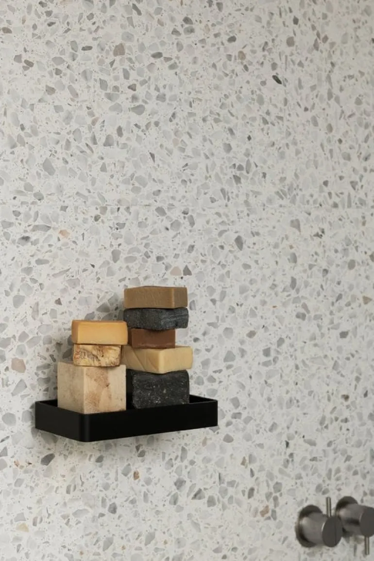 Audo Copenhagens duschhylla ger ett inslag av dansk minimalism i badrummet. Den pulverlackerade matta ytan ger duschhyllan en klar, grafisk och funktionell design medan den svarta Marquina-marmorn tillför en lyxig känsla. Duschhyllan designades av Norm Architects.