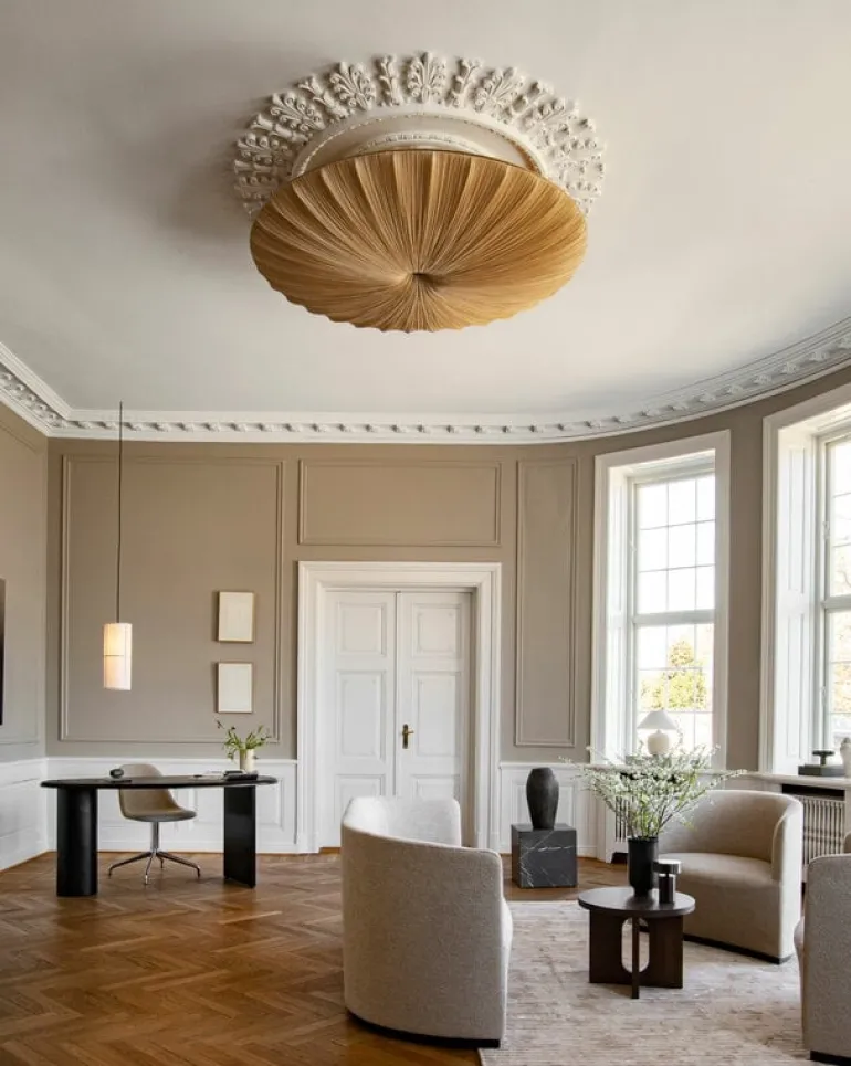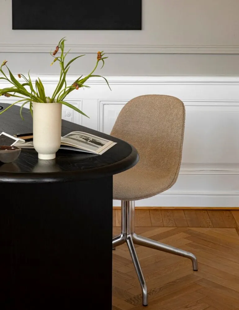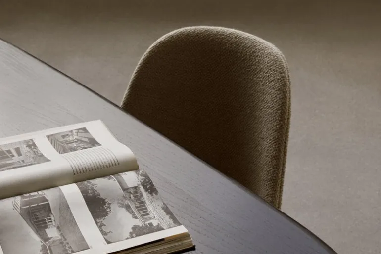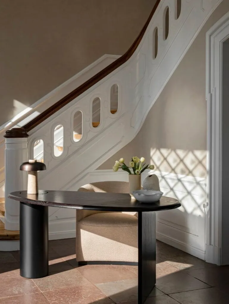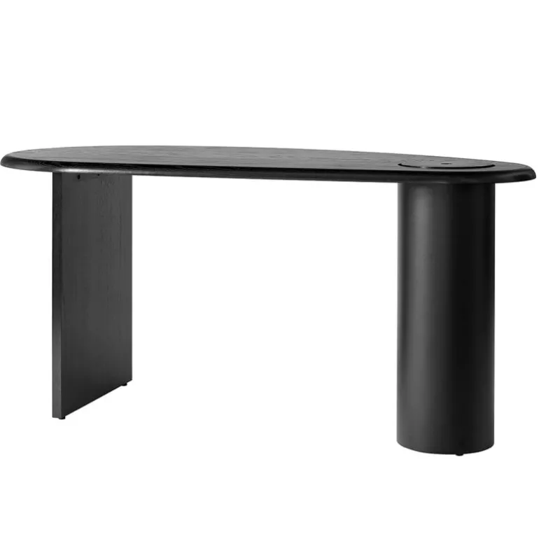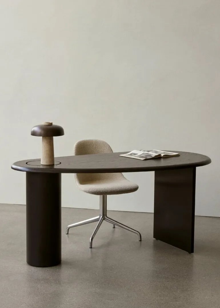 Audo Copenhagens skrivbord Eclipse är Fred Rigby Studios fascinerande utforskning av material och former, inspirerad av stenar som Fred Rigby har samlat på stranden. När man ser på det uppifrån påminner formen på bordsskivan verkligen om stenar som vågorna långsamt har slipat runda och släta.
