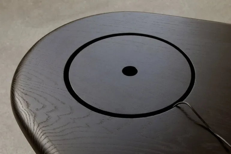 Förutom den unika bordsskivan har skrivbordet asymmetriska ben som också är ganska ovanliga: bordsskivan vilar på ett brett träben och en metallpelare, som samtidigt fungerar som förvaringsutrymme för till exempel en bordslampas kabel. Detaljen gör inte bara bordet distinkt, utan hjälper också till att hålla skrivbordet prydligt och att fokusera på arbetet istället för oordning. Jag vill att folk ska känna sig inspirerade när de sitter vid det. Att luta sig tillbaka och röra vid den böjda kanten; att hitta ett lugn inom sig för att fokusera på arbetet, har Rigby sagt.