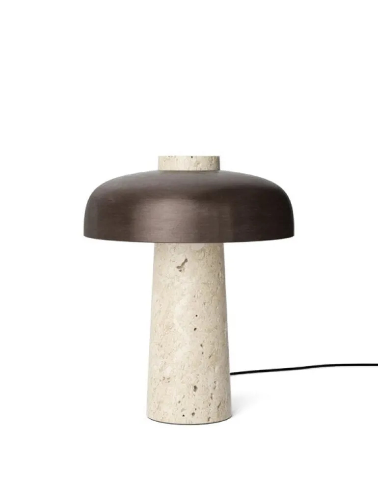 Audo Copenhagens Reverse är en karakteristisk och mångsidig lampa designad av den danske formgivaren Aleksandar Lazic. Armaturens form är en lek med geometriska former och dimensioner inspirerad av italiensk marmor från 1970-talet. Den grova känslan av basen i travertin skapar en intressant kontrast till den släta, eleganta skärmen i bronserad aluminium. Detaljerna i travertinstenen framträder när ljuset sprider sig över den ojämna ytan. Stenfoten får en naturlig patina som med tiden kommer att ge ett allt mer distinkt och charmigt intryck.