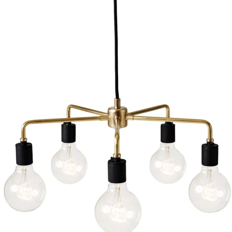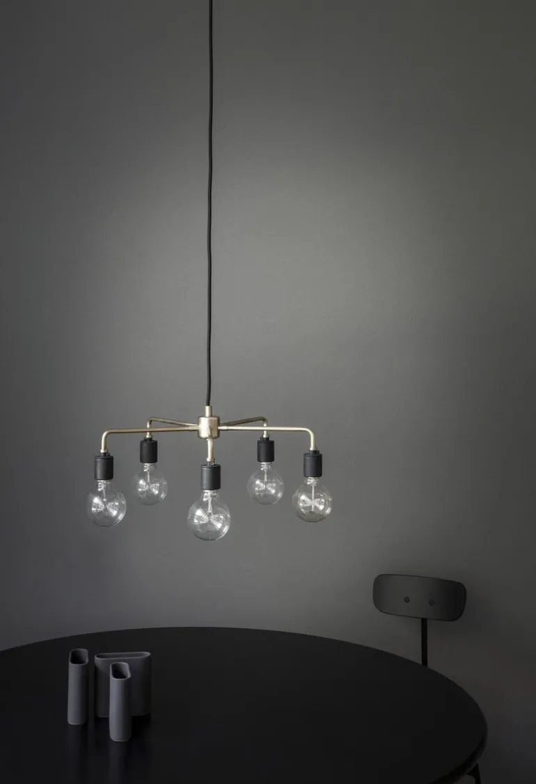Pendellampan Leonard från Audo Copenhagens Tribeca-kollektion har en vinklad, obehandlad mässingsram, som med tiden kommer att mörkna och få en vacker patina. Gruppen med fem glödlampor gör Leonard till en imponerande ljuskälla, även i större lokaler.