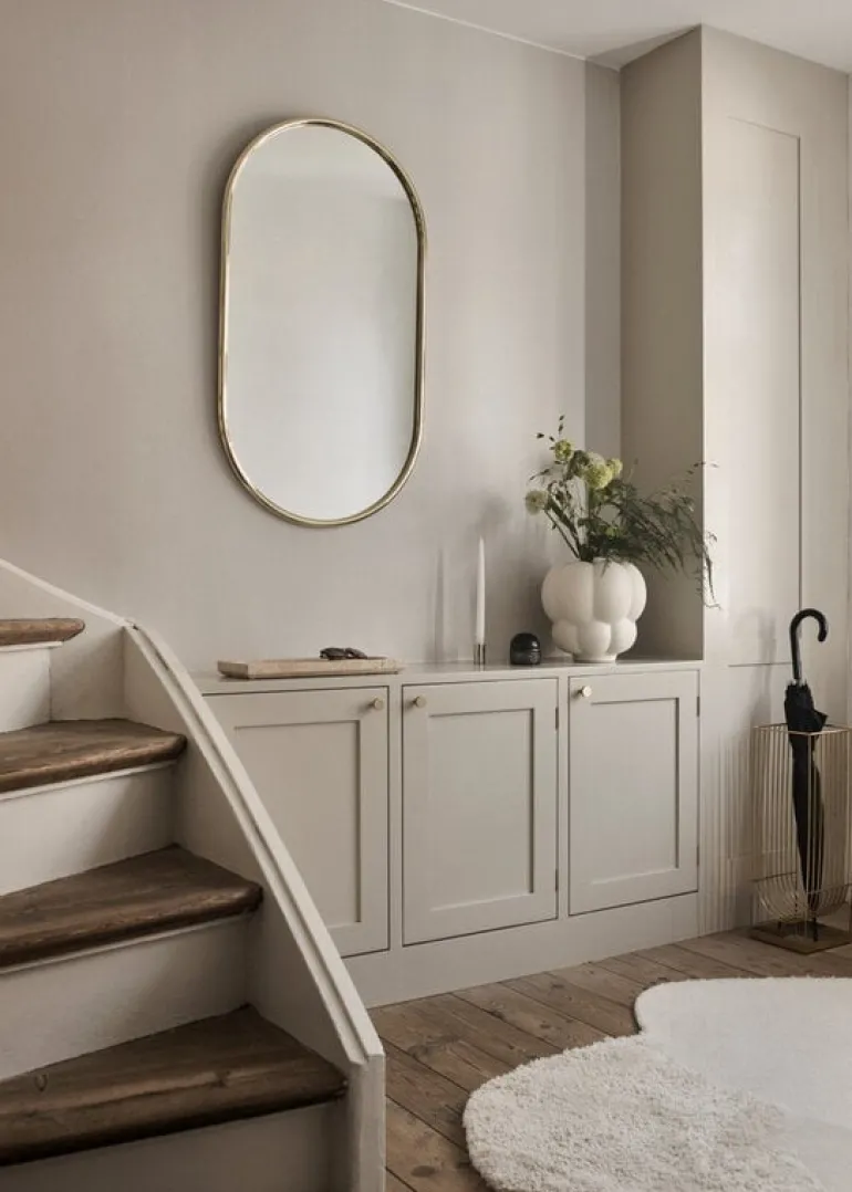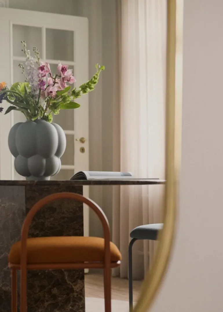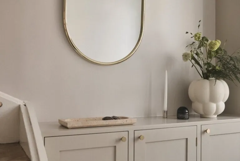 Spegeln Angui av danska AYTM charmerar betraktaren med sin kontrast mellan den elliptiska formen och den starka rörramen. Tack vare sin smala design passar Angui i små hallar och garderobsutrymmen, och dess distinkta färger ger en livfull touch till alla utrymmen.