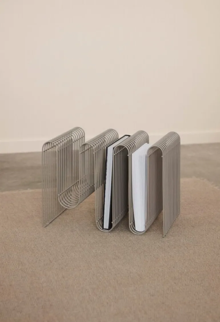 Tidningshållaren Curva från det danska märket AYTM fångar blicken med sin kurviga form och stilfulla finish. Tillverkad av böjt och belagt järn, är Curva perfekt för att förvara tidningar och papper på ett exceptionellt fascinerande sätt. Den 30 cm höga tidningshållaren finns med svart, silver, guld eller taupe finish, och den kan placeras antingen på golvet eller på ett bord.