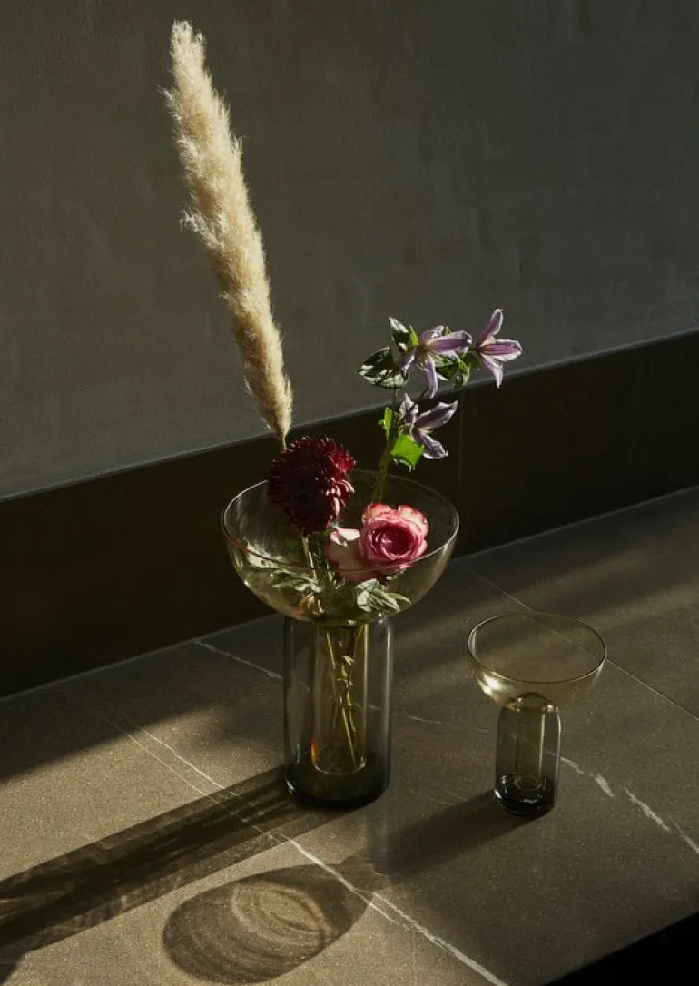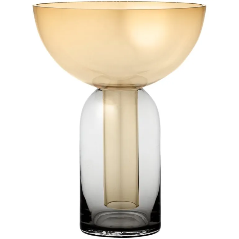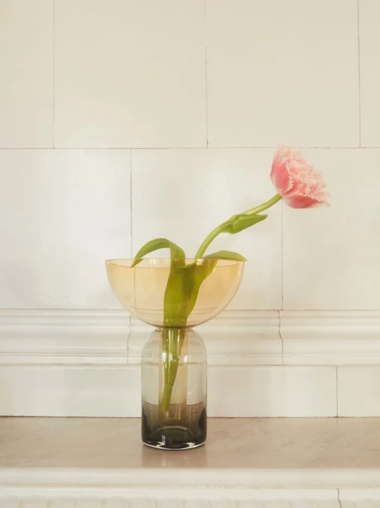 Torus-vasen av danska märket AYTM kännetecknas av en balans mellan olika geometriska former. Glasvasen består av en trattformad, färgad överdel som stöttas av en svarttonad bas. Den smala delen av tratten stöttar upp växtstjälkarna medan den breda toppen skapar en vacker inramning till frodiga buketter och dekorativa grenar. Med sin luftiga lager på lager-struktur är Torus ett mästerligt glasobjekt även utan blommor.