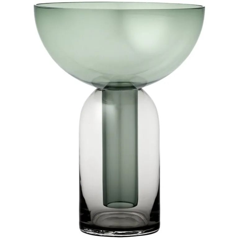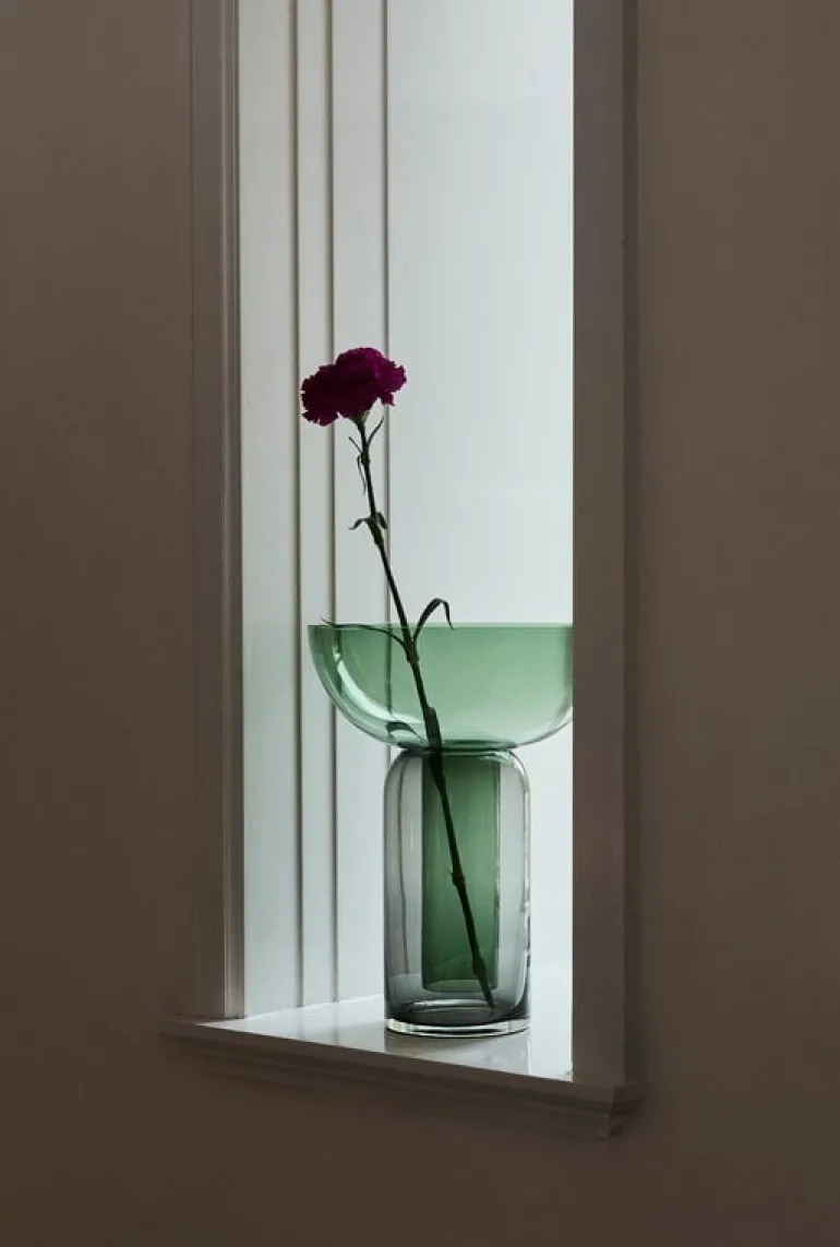 Torus-vasen av danska märket AYTM kännetecknas av en balans mellan olika geometriska former. Glasvasen består av en trattformad, färgad överdel som stöttas av en svarttonad bas. Den smala delen av tratten stöttar upp växtstjälkarna medan den breda toppen skapar en vacker inramning till frodiga buketter och dekorativa grenar. Med sin luftiga lager på lager-struktur är Torus ett mästerligt glasobjekt även utan blommor.