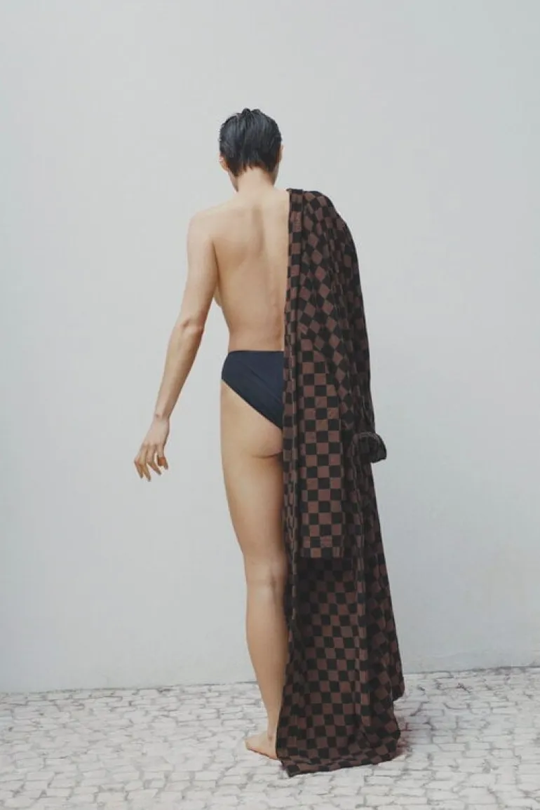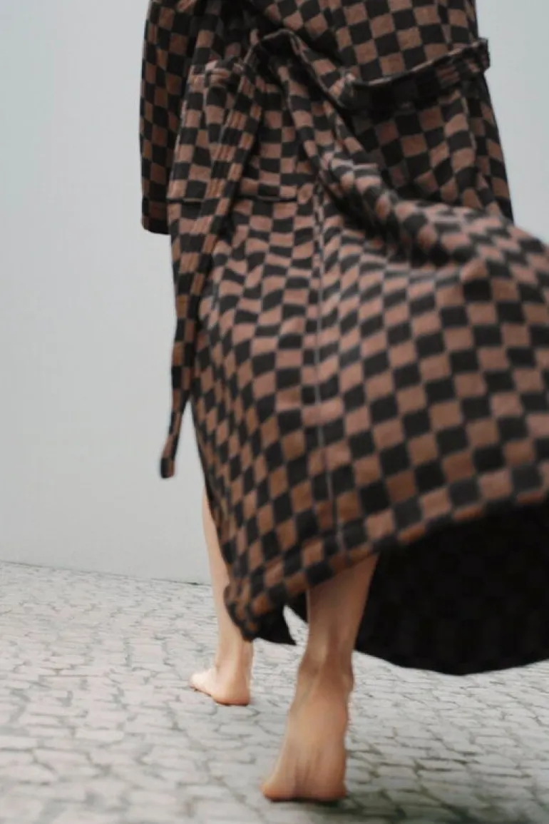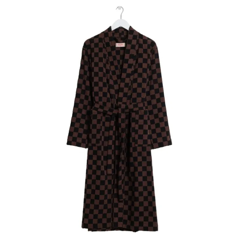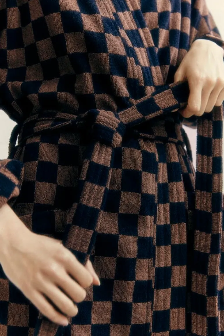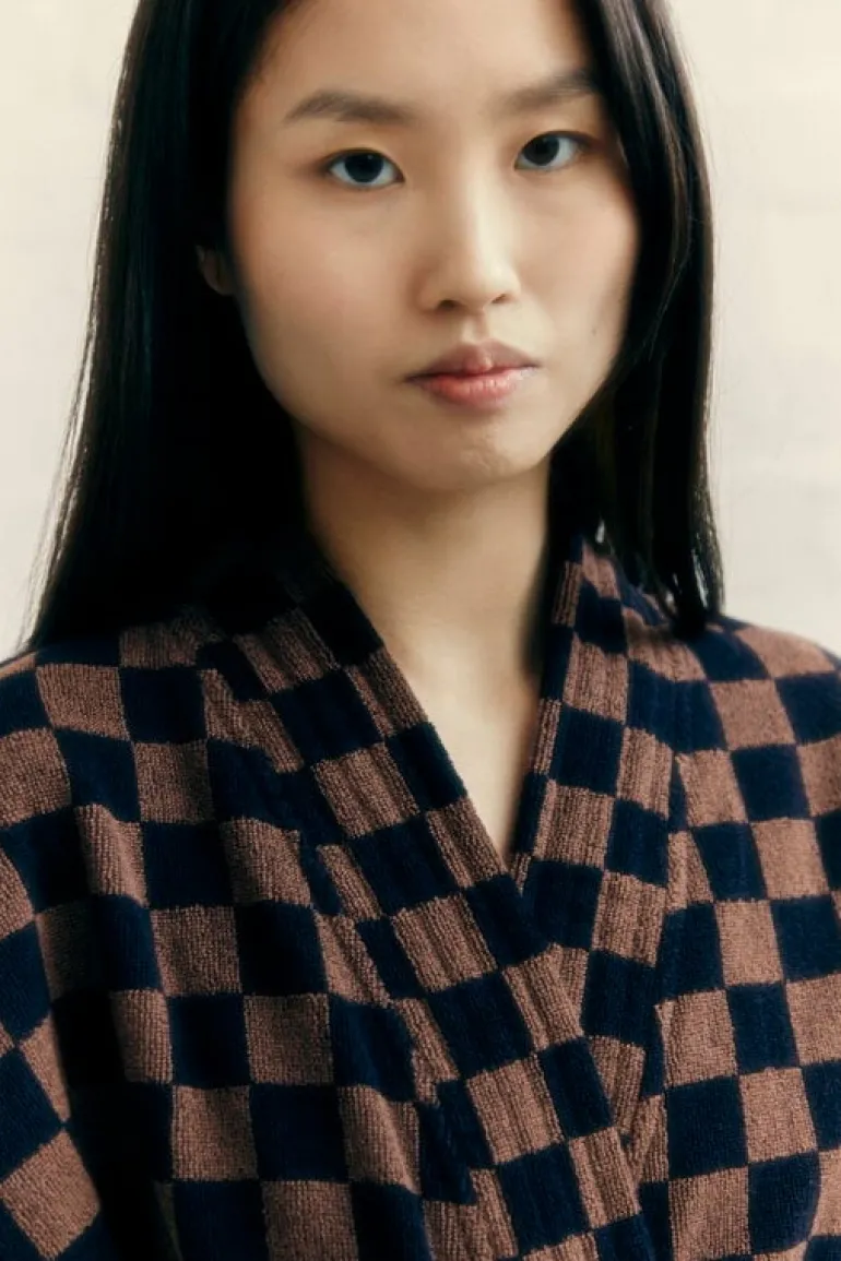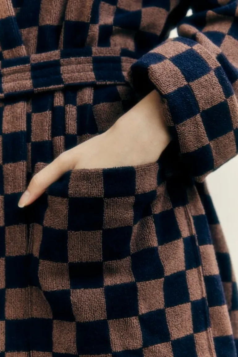 Badrocken Sulis från Baina har ett klassiskt, tvåfärgat schackrutigt mönster som utstrålar en lyxig, nostalgisk charm. Denna fluffiga, långklippta frottébadrock är tillverkad av mjuk, absorberande ekologisk bomull och har ett avtagbart skärp, framfickor och en ribbstickad krage.