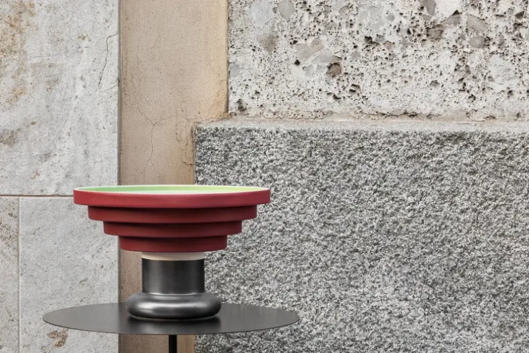 Uppläggningsfatet Alzata från Bitossi representerar den italienska designern och arkitekten Ettore Sottsass i sin renaste form: den experimentella moderna designen på skålen är karakteristiskt utsmyckad med en livfullt röd yta. Insidan av skålen är grön – en kontrasterande nyans, även det typiskt för Sottsass stil!