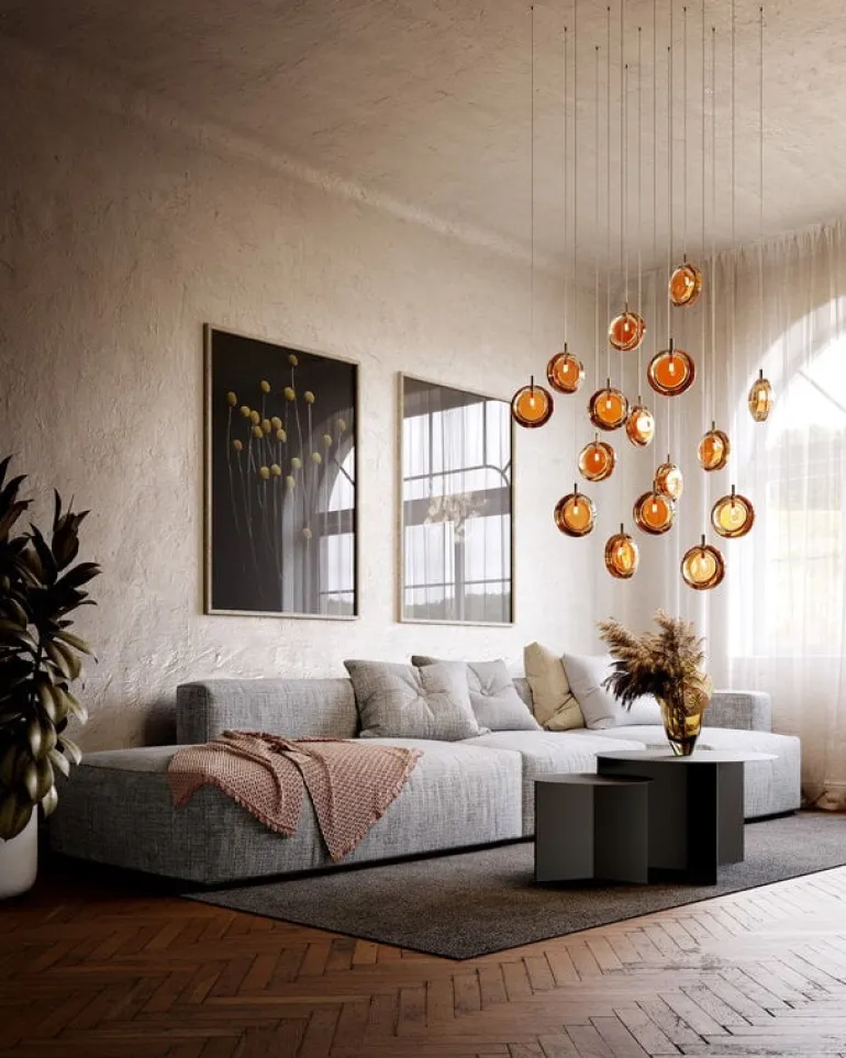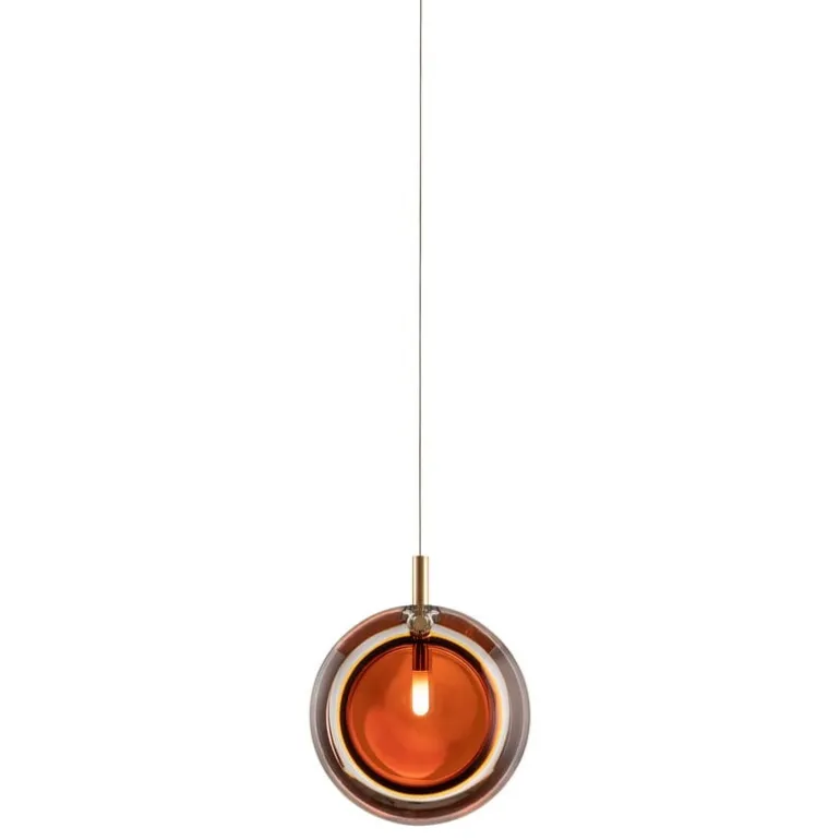Bommas pendel Lens Single är ett modernt belysningsmästerverk där minimalistisk design möter utsökt hantverk. Den linsliknande formen är tillverkad av munblåst, bärnstensfärgat kristallglas, vilket gör att varje exemplar är helt unikt tack vare den konstnärliga produktionsprocessen. Lens Single är en elegant blickfångare i sig själv, men får en helt ny dimension när flera pendellampor kombineras till en bländande klunga.