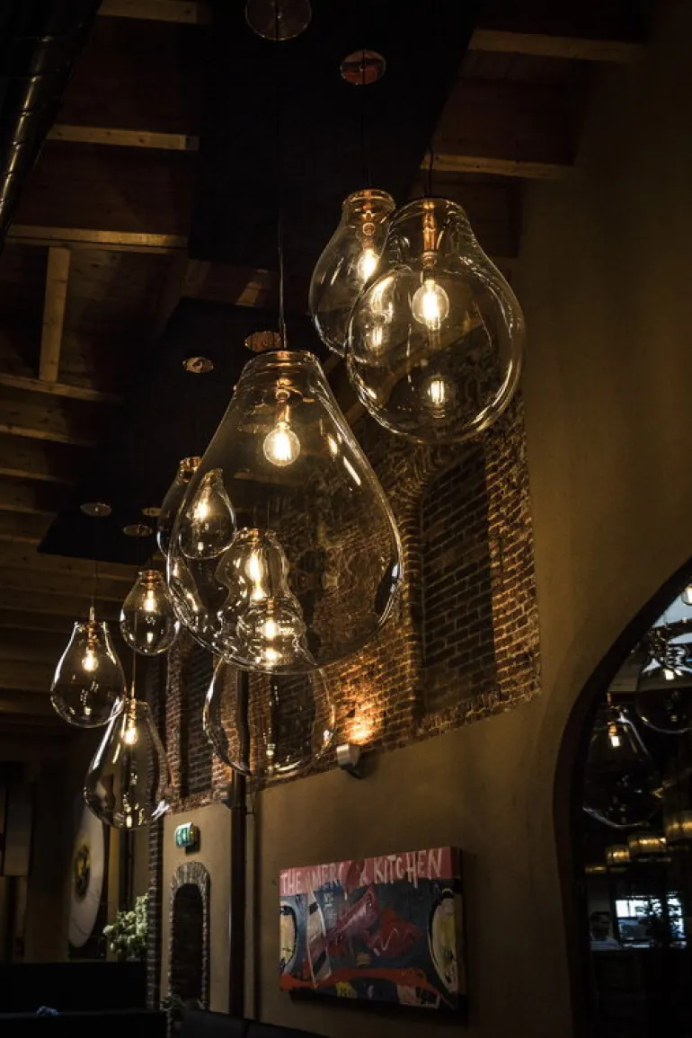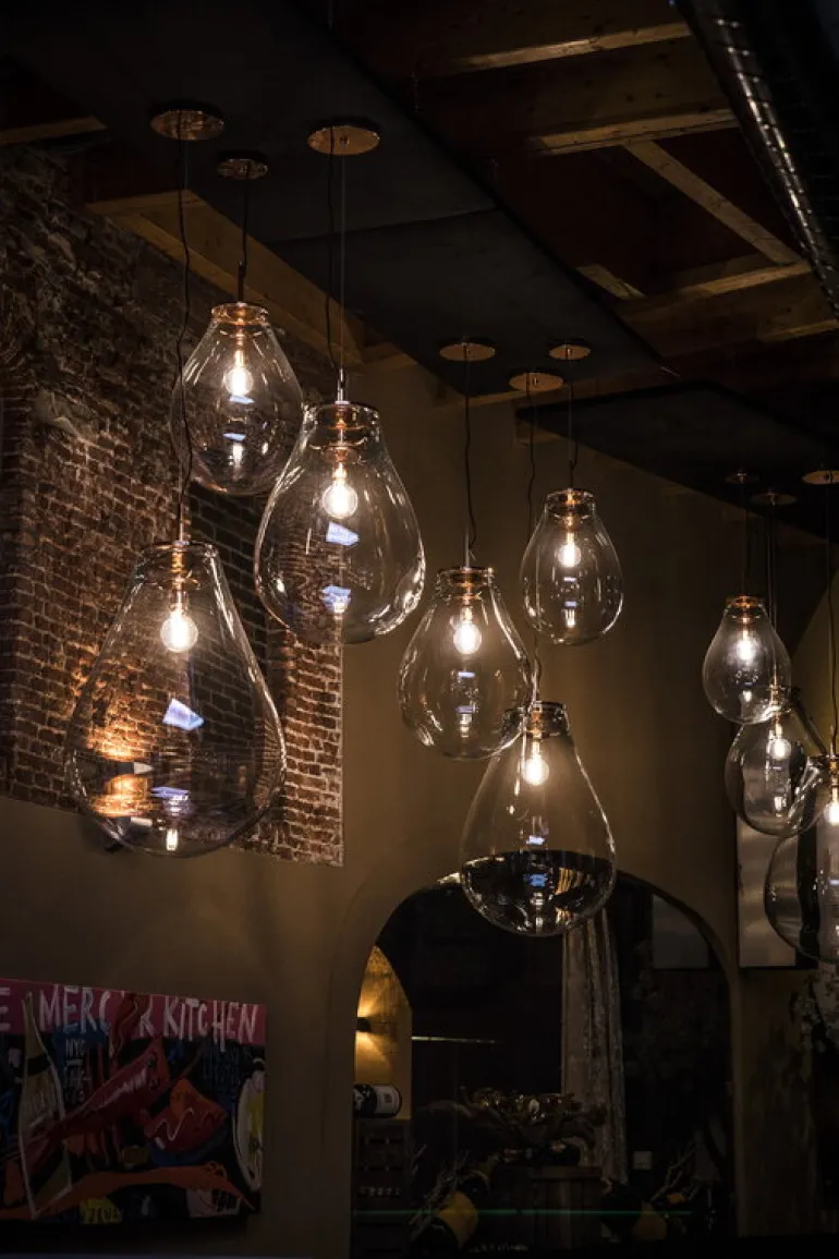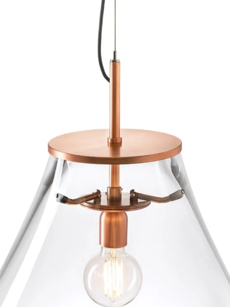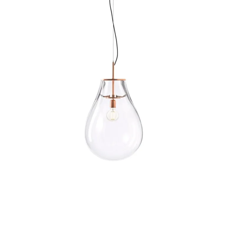 Bommas pendellampa Tim fångar blicken med sin slående enkelhet och djärva närvaro. Den överdimensionerade formen, kontrasterad med en liten glödlampa, skapar en fängslande visuell balans, som ytterligare förstärks av kopparinslagen som tillför djup och harmoniska detaljer. Hantverket bakom den munblåsta kristallglaset framhäver den otroliga skicklighet och precision som krävts för att uppnå en så till synes enkel design. Oavsett om den visas upp på egen hand eller som en del av en glittrande klunga, så lyser pendellampan Tim upp som en fantastisk fokuspunkt i alla interiörer.