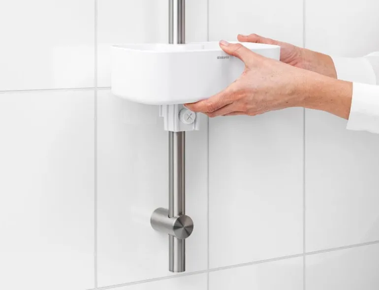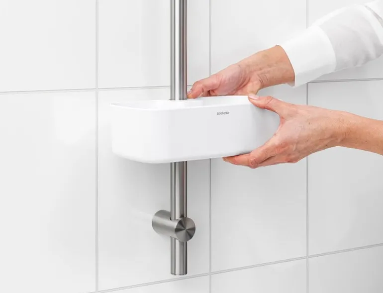 Duschhyllan ReNew från Brabantia håller schampo och duschtvål inom räckhåll. Hyllan är enkel att montera på duschstången vid önskad höjd och håller upp till 2 kg – så du kan ha flera flaskor i den! Duschhyllan har hål i botten som förhindrar ansamling av vatten.