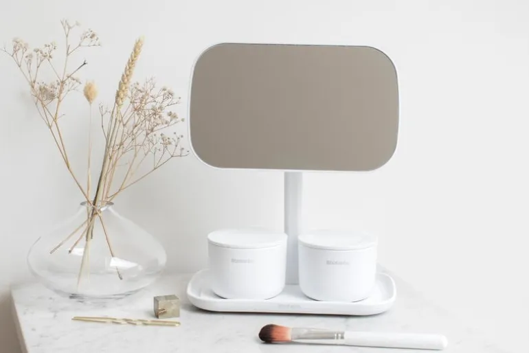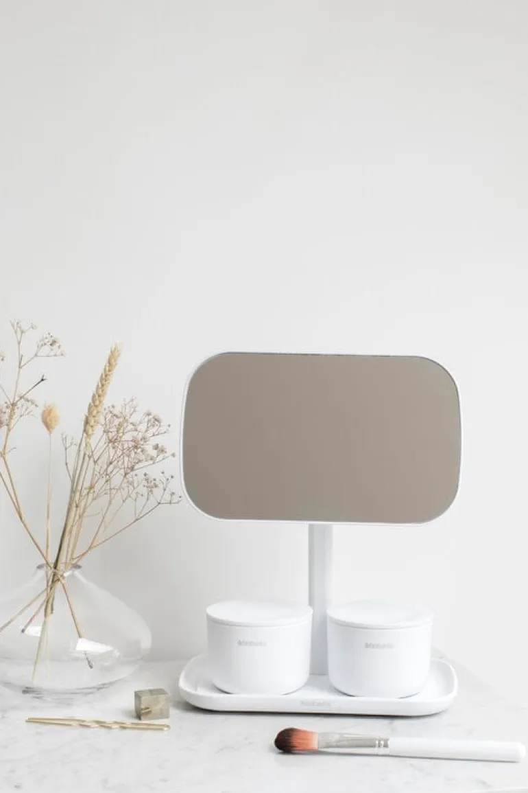 Brabantias bordsspegel har allt du kan tänkas behöva: en spegel som kan vridas 360 grader, en praktisk förvaringsbricka för smink, smycken eller håraccessoarer, samt en halkfri botten som håller spegeln på plats. Spegeln är tillverkad av korrosionsbeständiga material och har 5 års garanti.