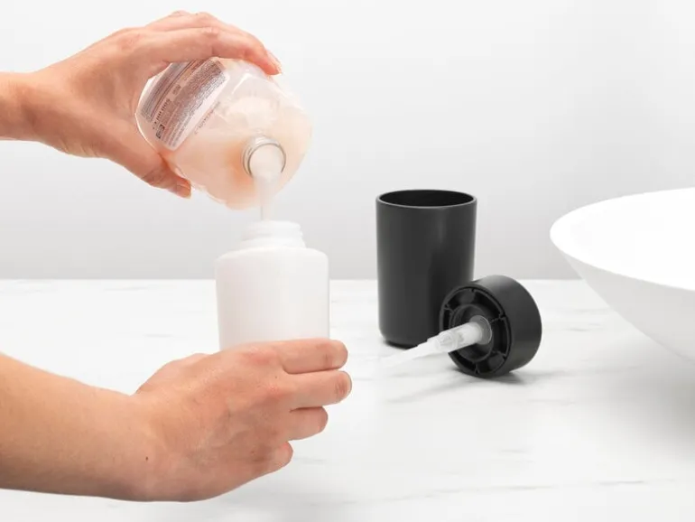 Tvåldispensern ReNew, från Brabantia, blir ett smart och praktiskt tillskott i badrummet. Den stiliga, stabila tvålpumpen har en halkfri undersida och en stor öppning som gör påfyllningen enkel. En dropp-fri mekanism och uttagbar innerbehållare gör även ReNew lätt att plocka isär och hålla ren. Brabantias tvålpump är en säker framtida favorit. Den rymmer 250 ml och materialen är särskilt utvalda för fuktiga utrymmen.